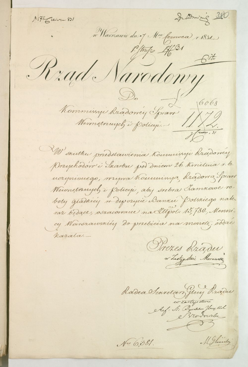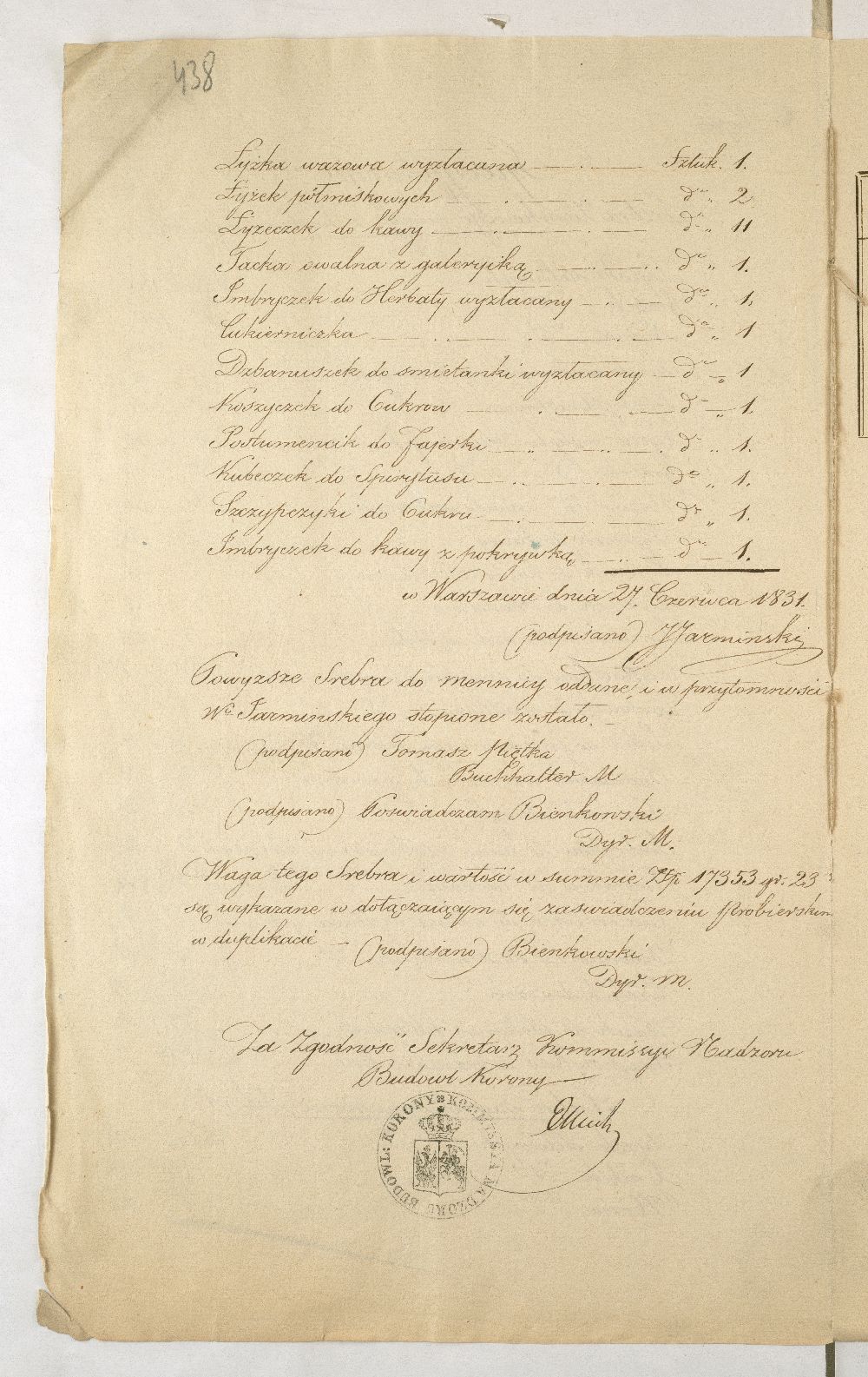 Pismo Rządu Narodowego w sprawie przebicia sreber zamkowych na monetę narodową oraz odpowiedź Komisji Nadzoru Budowl Korony wraz ze specyfikacją sreber.