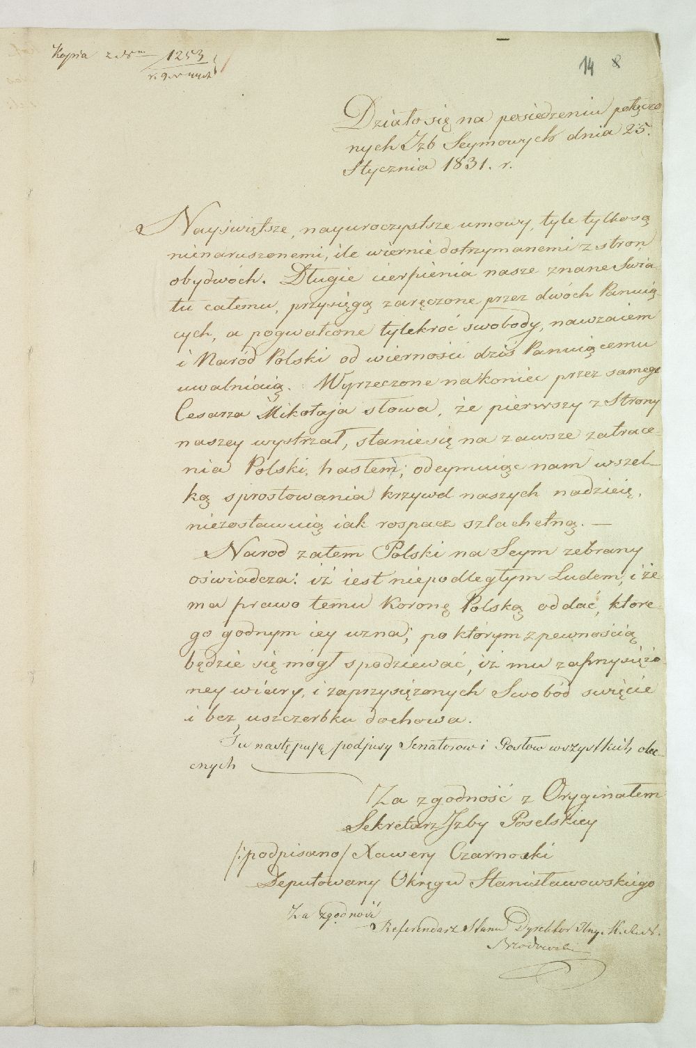 Akt detronizacji cesarza rosyjskiego Mikołaja I i dynastii Romanowów z tronu polskiego uchwalony na posiedzeniu połączonych izb sejmowych w Warszawie i wypowiedzenie mu posłuszeństwa w imieniu narodu polskiego.