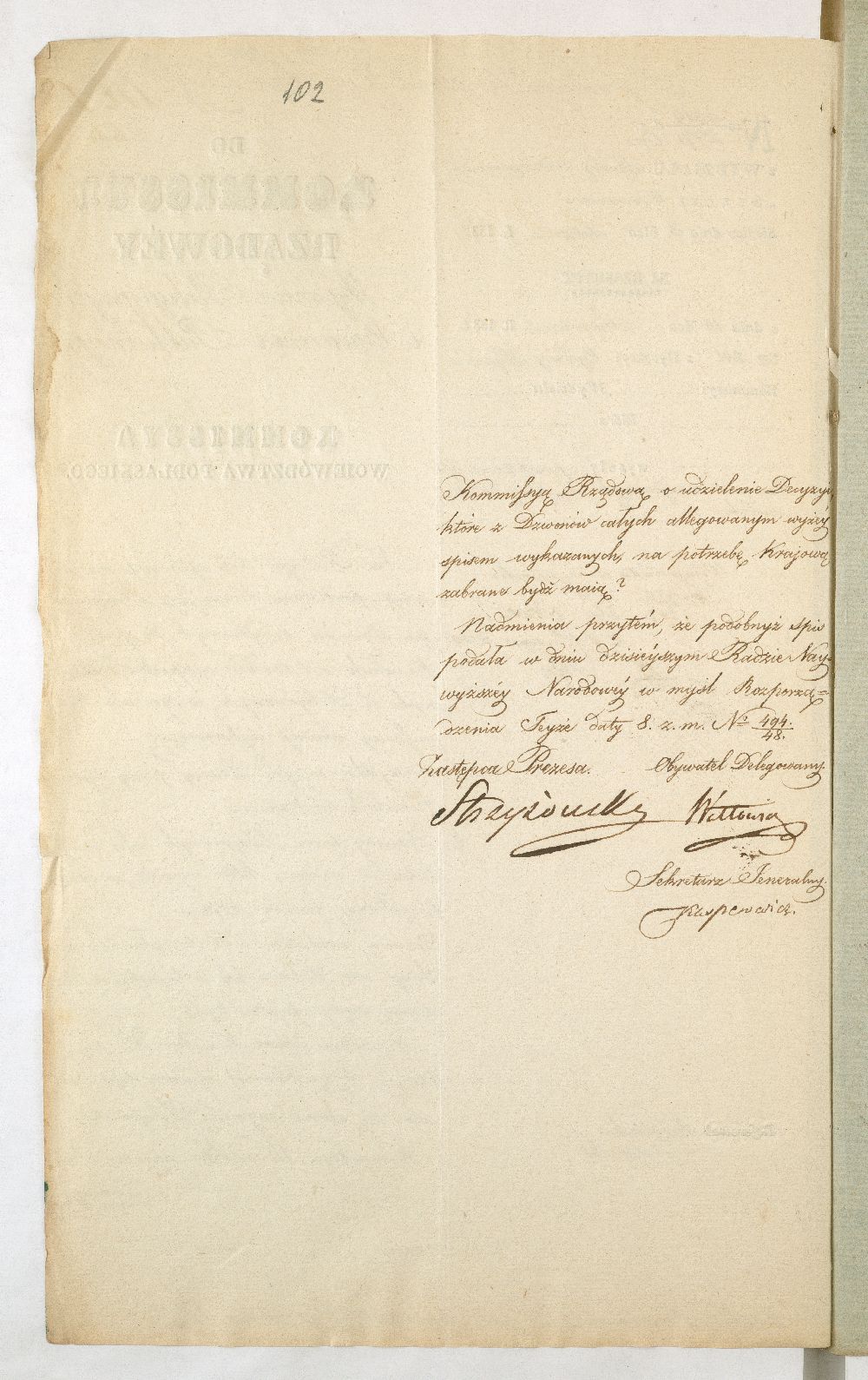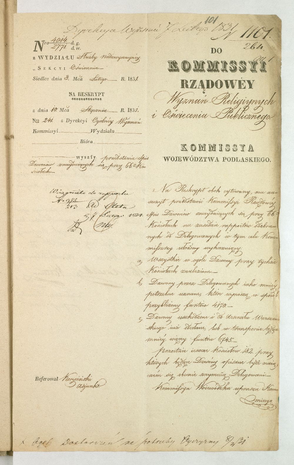 Pismo Komisji Województwa Podlaskiego do Komisji Rządowej Wyznań Religijnych i Oświecenia Publicznego z wykazem dzwonów znajdujących się przy kościołach, przeznaczonych na cele powstańcze.