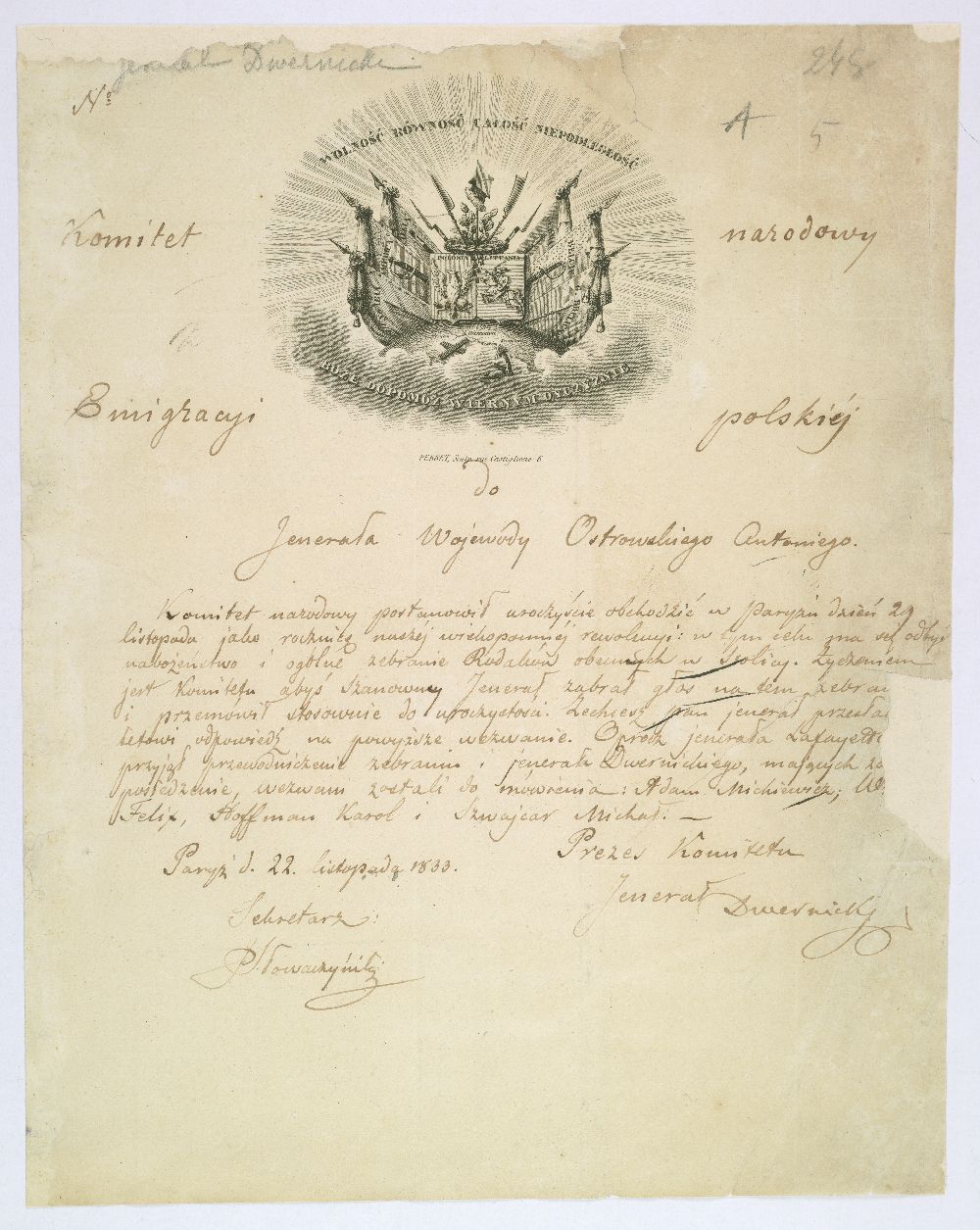 Pismo gen. Józefa Dwernickiego, prezesa Komitetu Narodowego Emigracji Polskiej, do Antoniego Ostrowskiego w sprawie obchodów rocznicy powstania listopadowego.