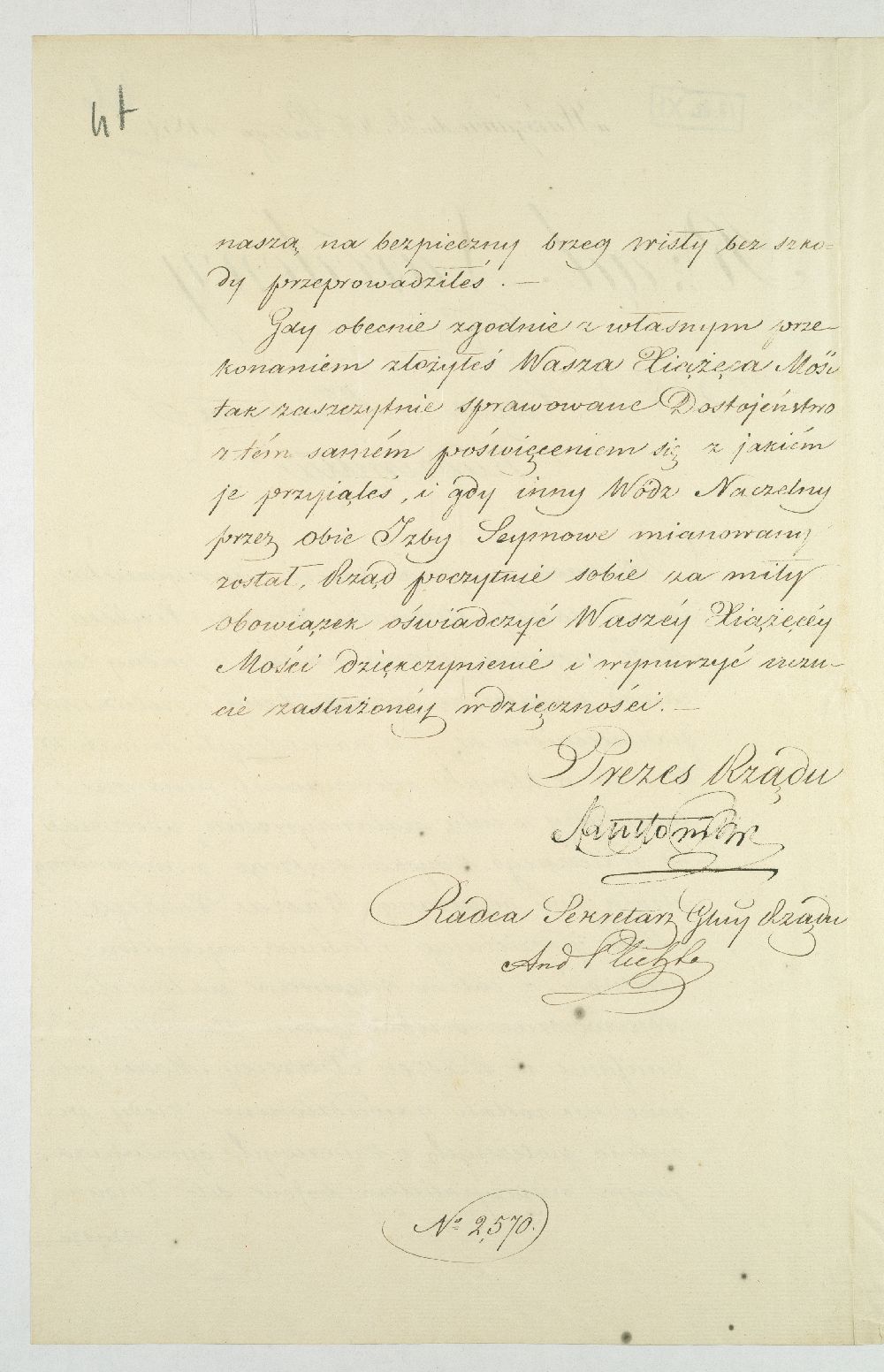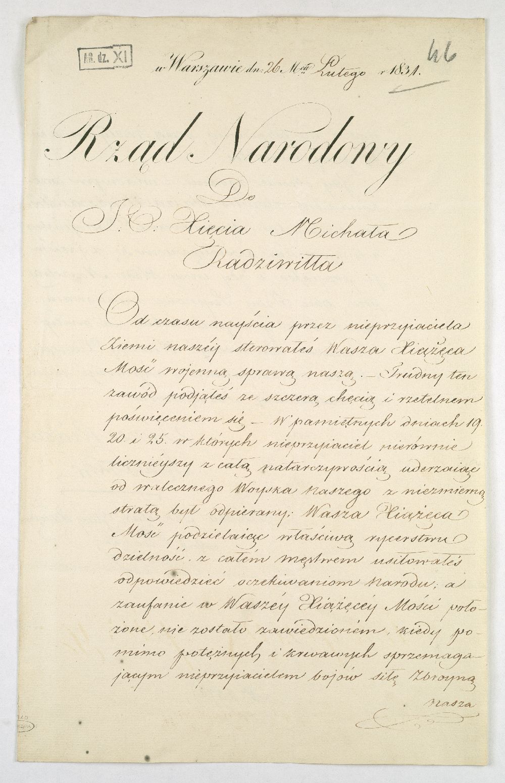Podziękowanie złożone przez Rząd Narodowy gen. dywizji Michałowi Gedeonowi Radziwiłłowi za pełnienie funkcji naczelnego wodza w powstaniu listopadowym.