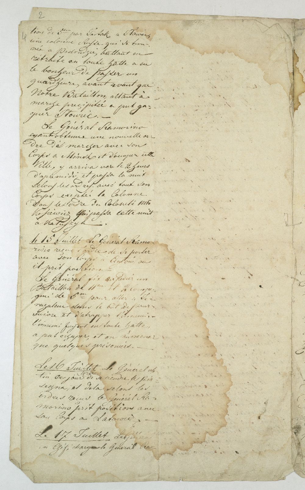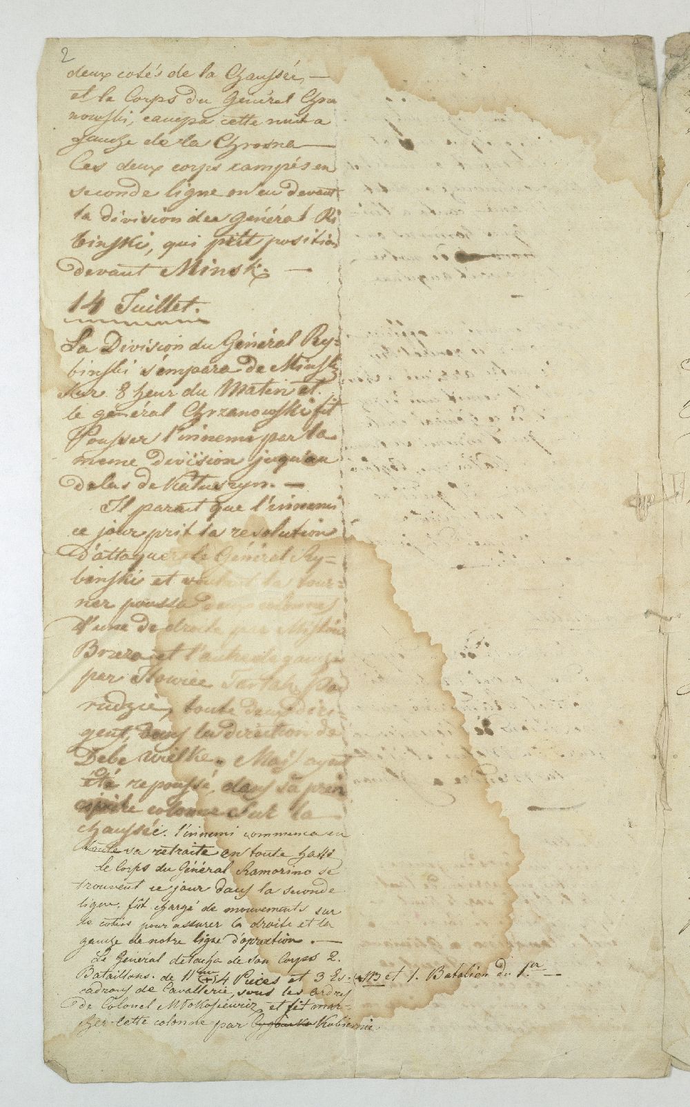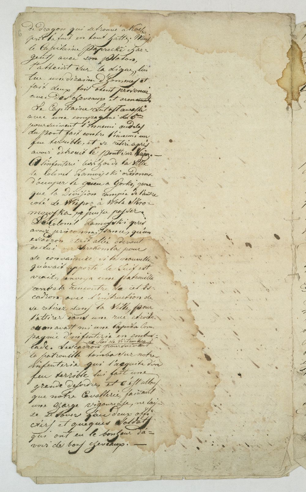 Prezentowany dokument jest fragmentem większego, anonimowego dziennika, opisującego działania na prawym brzegu Wisły w dniach 11-24 VII 1831 r. Przedstawia on walki, jakie toczyły oddziały polskie, pod ogólnym dowództwem gen. Wojciecha Chrzanowskiego, i siły rosyjskie pod wodzą gen. Jewgienija Gołowina. Relacja ta pozwala przyjrzeć się działaniom, które miały, według Polaków, zapobiec ewentualnej próbie zaskoczenia Warszawy od wschodu, w zamierzeniach rosyjskich miały zaś związać jak największe siły polskie z dala od głównego kierunku operacyjnego armii rosyjskiej, jakim była przeprawa przez Wisłę pod Osiekiem. Operacja grupy gen. Gołowina rozpoczęła się 4 lipca od zajęcia Siedlec i była kontynuowana poprzez rozpoznanie walką, mające dać odpowiedź, co do liczebności i położenia sił polskich. Stojące na drodze wojsk rosyjskich grupy gen. Macieja Rybińskiego i gen. Girolamo Ramorino, zdezorientowane zaczepnymi działaniami Rosjan, bojąc się starcia z liczniejszym (w przekonaniu dowódców) przeciwnikiem, wycofały się ze swych pierwotnych pozycji do Dębego Wielkiego i Garwolina. Pozwoliło to zająć Gołowinowi Kałuszyn (9 lipca) i pchnąć podjazdy aż pod Mińsk. Próba odzyskania utraconych pozycji następnego dnia nie powiodła się, co spowodowało powtórne cofnięcie się grupy Rybińskiego pod Dębe Wielkie, grupy Ramorino zaś do Glinianki (w tym momencie rozpoczyna się prezentowany fragment relacji). W toku swojego zaczepnego manewru gen. Gołowin, dysponujący niespełna 6 tys. żołnierzy, zdołał odepchnąć w stronę Warszawy oddziały polskie liczące prawie 16,5 tys. ludzi. Ośmieliło go to tak bardzo, że postanowił obejść przeciwnika i go zniszczyć (prawdopodobnie nie zdając sobie sprawy z jego przewagi liczebnej). Przybyły tymczasem na teatr operacyjny gen. Chrzanowski przyprowadził dodatkowe siły, które podniosły liczebność podległych mu wojsk do około 20 tysięcy. 13 lipca ześrodkował on swoje wojska na kierunku mińskim, i zamierzał uderzyć na wojska rosyjskie. Ponieważ Gołowin także podjął działania zaczepne, 14 lipca doszło do bitwy spotkaniowej pod Mińskiem Mazowieckim. Siły rosyjskie usiłowały zająć Mińsk, ubezpieczając jednocześnie swoje skrzydła. Chrzanowski podzielił swoje siły, odepchnął centrum ugrupowania rosyjskiego spod Mińska, jednak działający zbyt opieszale i bojaźliwie, na południe od niego, gen. Ramorino, nie próbował nawet przeciąć drogi wycofującemu się na Kałuszyn Gołowinowi. Idący na północ od Chrzanowskiego gen. Jagmin, także nie zdołał odciąć drogi odwrotu siłom rosyjskim, mimo sukcesów płk. Franciszka Młokosiewicza. Wobec błędów dowództwa polskiego gen. Gołowinowi udało się dotrzeć z wojskiem do Siedlec (15 lipca). Siły polskie tymczasem rozłożyły się w Kałuszynie, rezygnując z pościgu. Dopiero wieczorem 15 lipca siły Chrzanowskiego ruszyły w stronę Kuflewa, co było spowodowane pogłoskami o zbliżaniu się grupy gen. Fiodora Rüdigera. Do sił polskich dołączył wódz naczelny, gen. Józef Skrzynecki, który jednak nie kwapił się do energicznych działań przeciw siłom Rüdigera. Większość sił grupy Chrzanowskiego 17 lipca pozostała na stanowiskach pod Kuflewem, nieliczne oddziały wysłano zaś, pod dowództwem gen. Ramorino, w stronę Kocka, skąd mieli maszerować Rosjanie. Dopiero 18 lipca Chrzanowski ruszył do Łukowa, jednak raporty Ramorino spowodowały zarzucenie myśli o uderzeniu na grupę Rüdigera. Będący teraz głównodowodzącym na tym odcinku naczelny wódz postanowił jeszcze raz skierować siły polskie przeciwko gen. Gołowinowi, stojącemu w Siedlcach. Trzy kolumny polskie ruszyły 19 lipca na Siedlce chcąc całkowicie osaczyć miasto. Gen. Gołowin nie zaniechał jednak rozpoznania i, wiedząc o manewrze Skrzyneckiego, cofnął się ze swymi siłami w kierunku Brześcia. Nie zastano już Rosjan w Siedlcach. Generał Józef Skrzynecki wyjechał do Warszawy 22 lipca, wydając jednocześnie grupom Rybińskiego i Ramorino rozkaz kierowania się ku stolicy. Pod Mińskiem operował jeszcze do 23 lipca gen. Chrzanowski. Wkrótce i on dokonał odwrotu do stolicy. Cała operacja skończyła się zupełnym fiaskiem. Na wschód od Wisły nie osiągnięto w jej toku żadnego większego sukcesu, za to w czasie jej trwania feldmarszałek Iwan Paskiewicz przeprawił swą armię pod Osiekiem na lewy brzeg Wisły (między 16 a 20 lipca). |