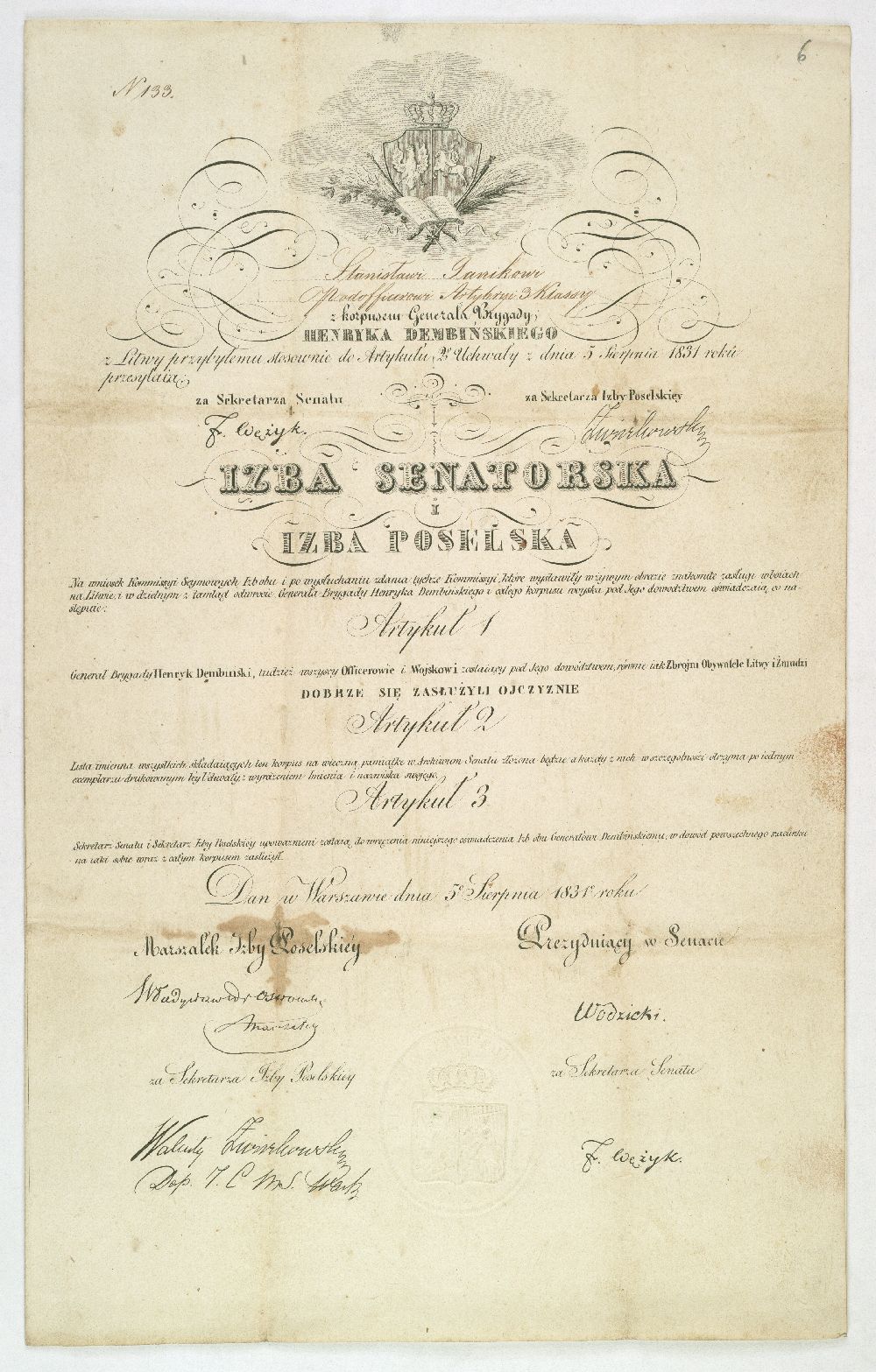 Dyplom pochwalny połączonych Izb Sejmowych dla Stanisława Janika, podoficera artylerii w korpusie gen. brygady Henryka Dembińskiego, przyznany w dowód uznania za zasługi w walkach na Litwie i Żmudzi.
