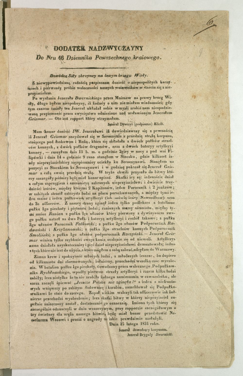 Dodatek nadzwyczajny do sygn. 46 „Dziennika Powszechnego Krajowego” - doniesienie gen. dywizji Stanisława Klickiego o bitwie stoczonej 14 II 1831 r. pod Stoczkiem Łukowskim, z załączonym raportem gen. brygady Józefa Dwernickiego.
