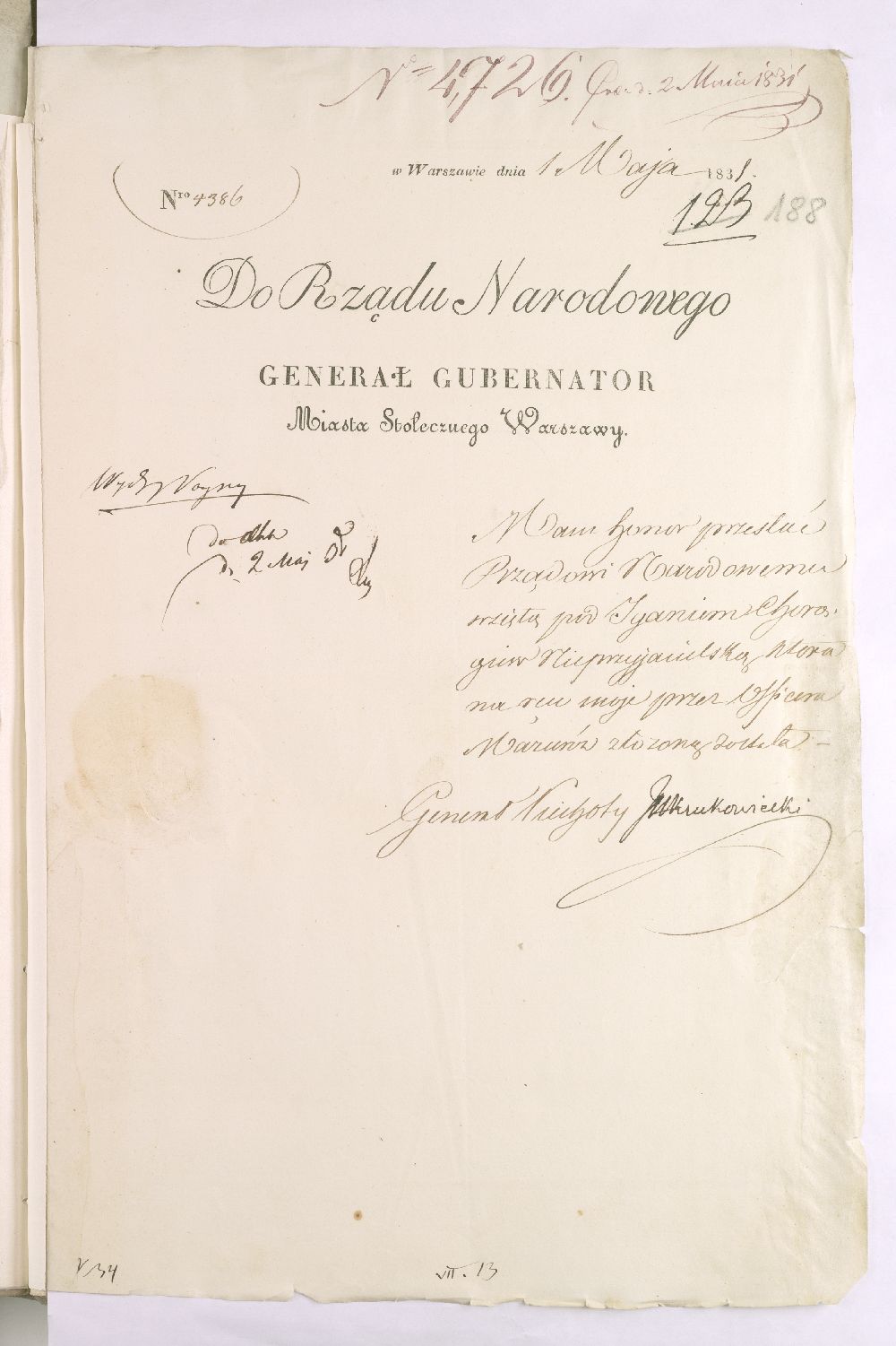 Miejsce przechowywania | AGAD, Władze Centralne Powstania Listopadowego 1830-1831, sygn. 262, s. 188. |