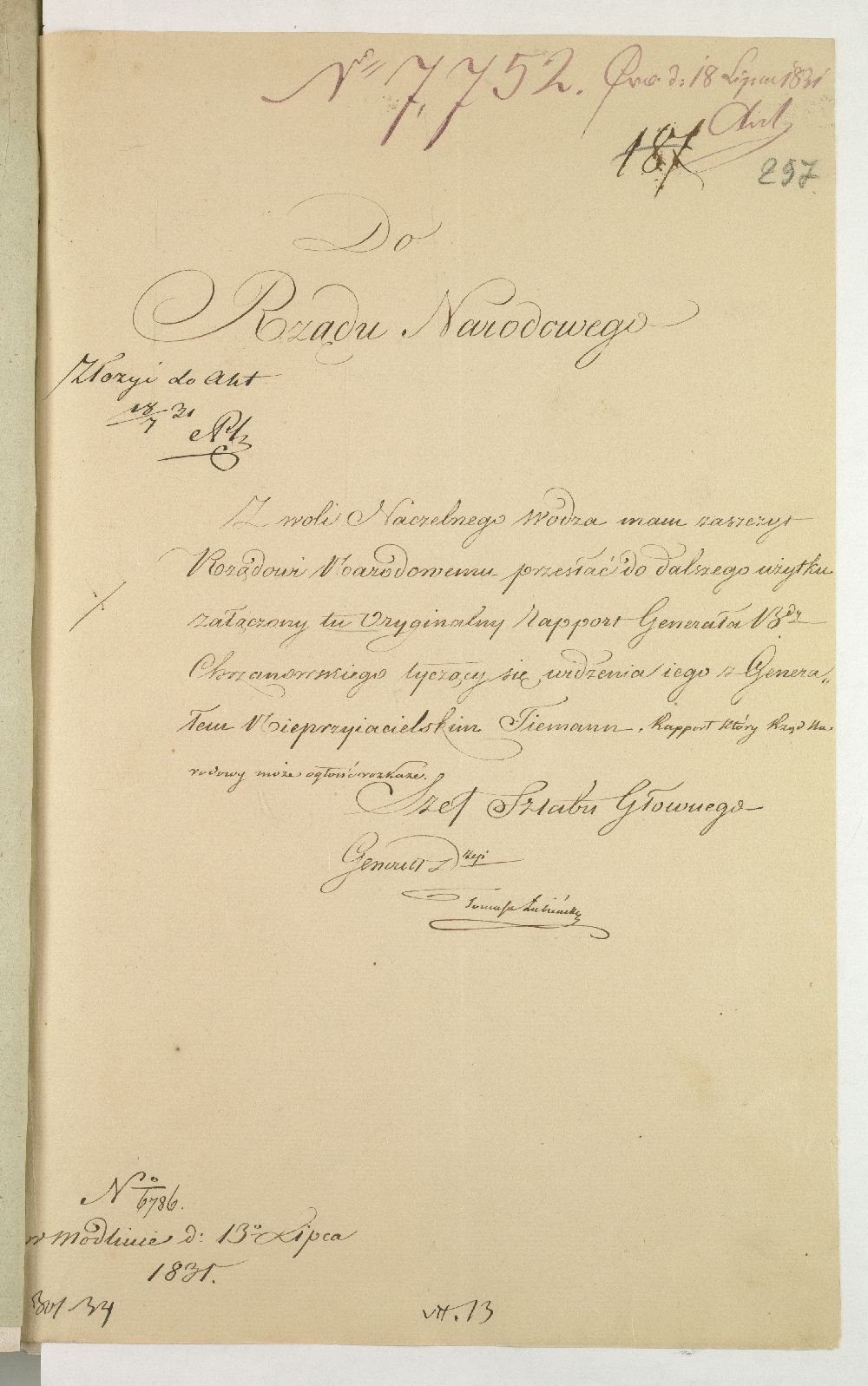 Pismo gen. dywizji Tomasza Łubieńskiego, szefa Sztabu Głównego, informujące Rząd Narodowy o przekazaniu „do dalszego użytku”, złożonego na jego ręce raportu gen. brygady Wojciecha Chrzanowskiego, dotyczącego spotkania z „generałem nieprzyjacielskim Tiemann” oraz ww. raport.