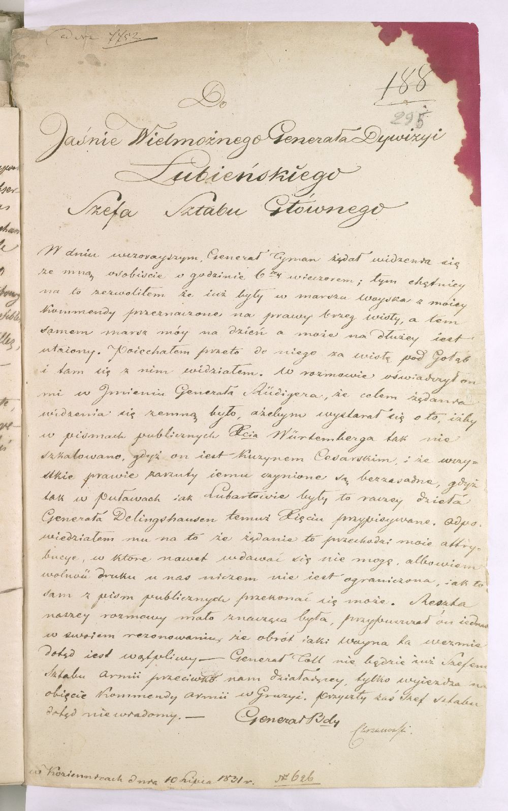 Tomasz Łubieński (1784-1870) po wkroczeniu Francuzów do Warszawy w 1806 r. wstąpił do straży honorowej cesarza Napoleona. 24 X 1806 r. został mianowany zastępcą dowódcy tej formacji. Uczestniczył w bitwach pod Pułtuskiem i Iławką. W kwietniu 1807 r. otrzymał Krzyż Legii Honorowej i nominację na szefa szwadronu w nowoutworzonym pułku lekkokonnym gwardii. Od lutego 1808 r. do stycznia 1809 r. brał udział w kampanii hiszpańskiej. W 1809 r. otrzymał Krzyż Oficerski Legii. W kampanii austriackiej w 1809 r. wyróżnił się w bitwach pod Essling i Wagram. Odznaczony Krzyżem Virtuti Militari. Brał udział w kampanii 1812 r. W styczniu 1814 r. podał się do dymisji. Do służby polskiej przeszedł w stopniu generała-majora. W 1815 r. popadł w konflikt z w. ks. Konstantym i w 1816 r. podał się do dymisji. W latach 1825-1828 był sędzią pokoju pow. chełmskiego. Dwa razy posłował na sejm (1820 i 1825); zasiadał w komisji administracyjnej. W 1829 r. uzyskał nominację na senatora - kasztelana, pomimo iż nie był podany na kandydata przez senat, jak tego wymagała konstytucja. Brał udział w zawiązaniu Towarzystwa Kredytowego Ziemskiego, a w latach 1826-1828 zasiadał w jego Dyrekcji Głównej. 30 XI 1830 r. został mianowany wiceprezydentem Warszawy, gdzie sprawował rządy niemal samodzielnie. Powołana przez niego Rada Municypalna była tylko organem wykonawczym. Zasiadając na tym urzędzie Łubieński stawiał sobie za cel utrzymanie porządku w mieście, rozbrojenie ludności i hamowanie dążeń rewolucyjnych. Po wybuchu powstania, w tym duchu sprawował powierzony mu przez dyktatora, gen. Józefa Chłopickiego, urząd w Dyrekcji Poczt i Policji Krajowej. 21 XII 1830 r. został zastępcą ministra spraw wewnętrznych; zwolniony 6 I 1831 r. wrócił do czynnej służby wojskowej. W obradach senatu uczestniczył do 7 II 1831 r. Akt detronizacji Mikołaja I podpisał niechętnie, następnego dnia zgłaszając do niego poprawkę. Brał udział w bitwie pod Wawrem, gdzie ledwo uniknął pogromu przez przeważające siły rosyjskiej. W bitwie pod Grochowem, pomimo rozkazu, odmówił pójścia do ataku, co stało się powodem ataków na jego osobę ze strony gen. Chłopickiego i gen. Ignacego Prądzyńskiego. Po bitwie grochowskiej Łubieński dążył do rokowań z Iwanem Dybiczem i kapitulacji. Był przeciwny działaniom ofensywnym, a przekonany o daremności walki i rychłej klęsce opowiadał się za ugodą z Rosją. 1 IV 1831 r. starł się z korpusem litewskim Georga Rosena, prowadząc walkę bardzo nieudolnie; nie wykorzystał szansy, jaką kampania ta dawała stronie polskiej. 22 V 1831 r. dał się zaskoczyć Dybiczowi pod Nurem. Z dużą ostrożnością prowadził działania pod Ostrołęką, a po klęsce opowiadał się za odwrotem do Warszawy. 1 VI 1831 r. gen. Jan Skrzynecki mianował go generałem dywizji i szefem sztabu, przejściowo zdając na niego dowództwo armii. Jako szef sztabu okazał się dobrym organizatorem. Latem powstanie chyliło się już ku upadkowi. Dowództwo, któremu brakowało woli i wiary w sukces, zaczęło przedkładać cele prywatne nad dalszą walką. Generalicja myślała o poddaniu się, uzyskaniu ułaskawienia cesarskiego i zachowaniu własnych pozycji wojskowych, politycznych i majątkowych. Wojsko rozłożone pod Pragą pozostawało bezczynne, co prowadziło do osłabienia dyscypliny i postępującej demoralizacji. Oficerowie bawili się w Warszawie, politykowali, brali urlopy. Z tego okresu pochodzi prezentowane pismo, w którym Łubieński, jako Szef Sztabu Głównego, informuje Rząd Narodowy, o przesłaniu na rozkaz Naczelnego Wodza, oryginału raportu gen. brygady Wojciecha Chrzanowskiego, dotyczącego „widzenia jego z Generałem Nieprzyjacielskim Tiemann”, które miało miejsce w obozie pod Gołębiem. Tematem tego spotkania miały być nie tyle aktualne sprawy prowadzonej wojny, co osoba „księcia Würtemberga” (ks. Adam Wirtemberski, wnuk ks. Izabeli z Czartoryskich Lubomirskiej, oskarżany o zbombardowanie Puław), którego szkalowano w prasie polskiej, a zdaniem strony przeciwnej, taka sytuacja nie powinna mieć miejsca, gdyż był on kuzynem cesarskim. W tej sprawie miał interweniować Chrzanowski, który jednak nie wyraził na to zgody, powołując się na wolność druku w państwie polskim. Poza tym, wg relacji Chrzanowskiego spotkanie dotyczyło spraw „mało istotnych”. Pod pismem przewodnim figuruje oryginalny podpis Łubieńskiego. 15 VIII 1831 r. Łubieński odrzucił ofiarowane mu przez Rząd Narodowy naczelne dowództwo. Cztery dni później przyjął je z rąk gen. Jana Krukowieckiego. Przeciwny stoczeniu walnej bitwy z Paskiewiczem, 20 sierpnia zrezygnował z tej funkcji. Nie powrócił na stanowisko szefa sztabu. Przeczuwając bliski koniec powstania i upadek Warszawy, postarał się o odkomenderowanie na tyły głównych działań wojennych. 28 IX 1831 r. podał się do dymisji. Po upadku powstania został zesłany do Rosji. Po audiencji, jakiej udzielił mu Mikołaj I w listopadzie 1831 r. i po wyrażeniu skruchy, został uwolniony. W 1832 r. wziął udział w deputacji hołdowniczej do Petersburga. |