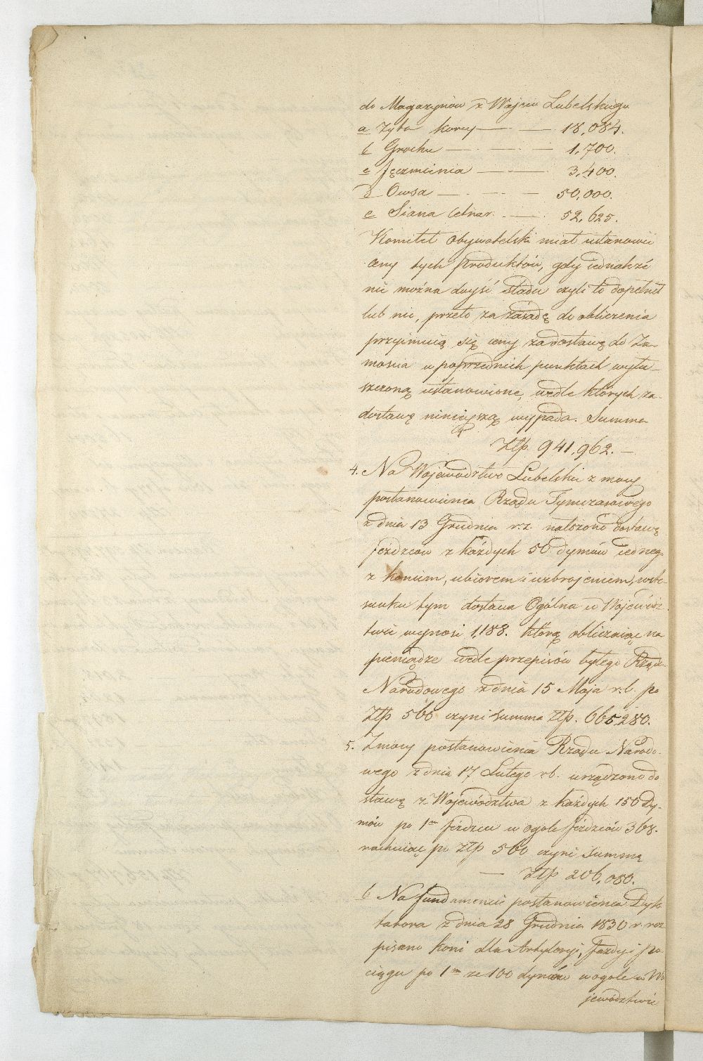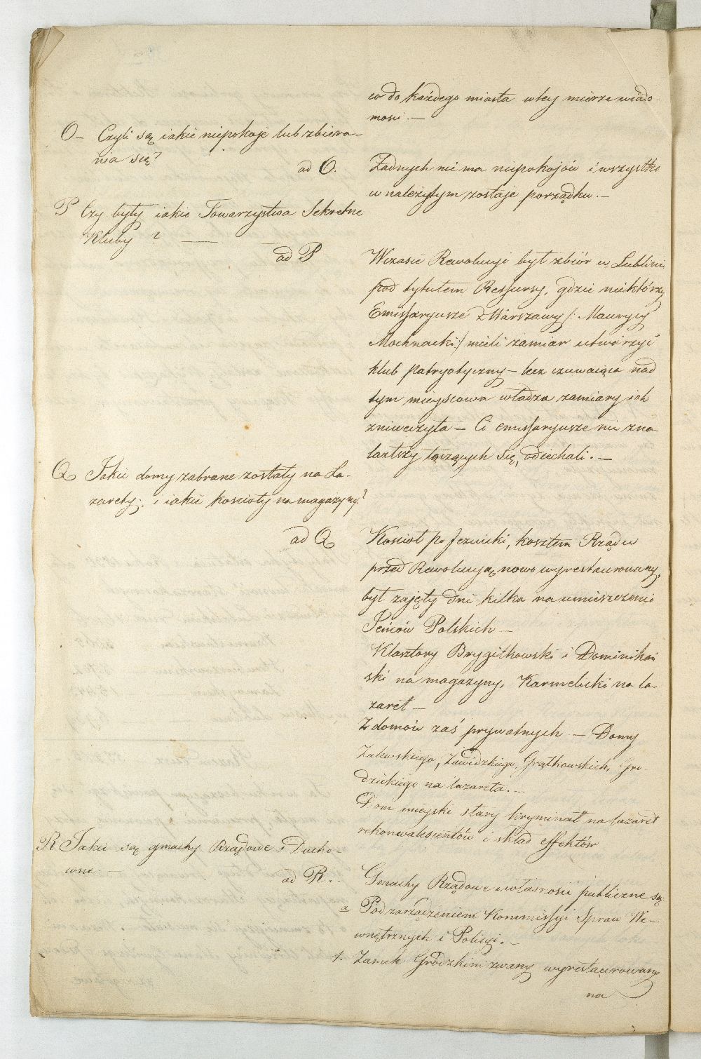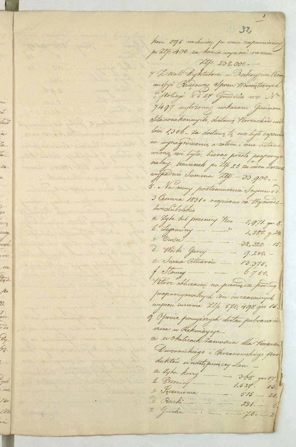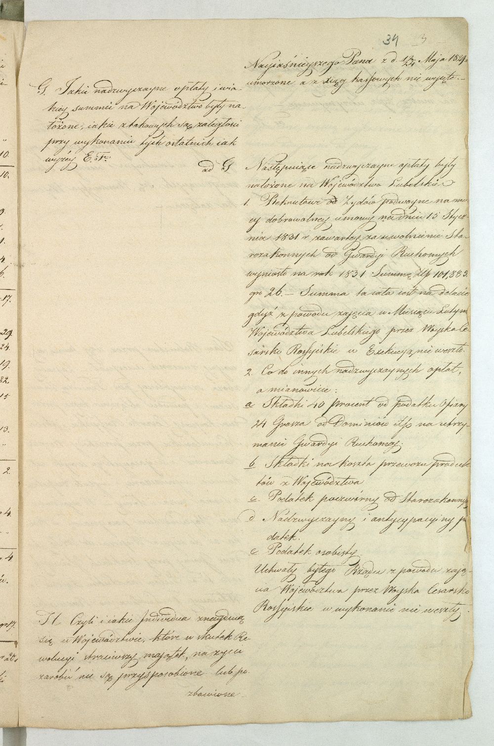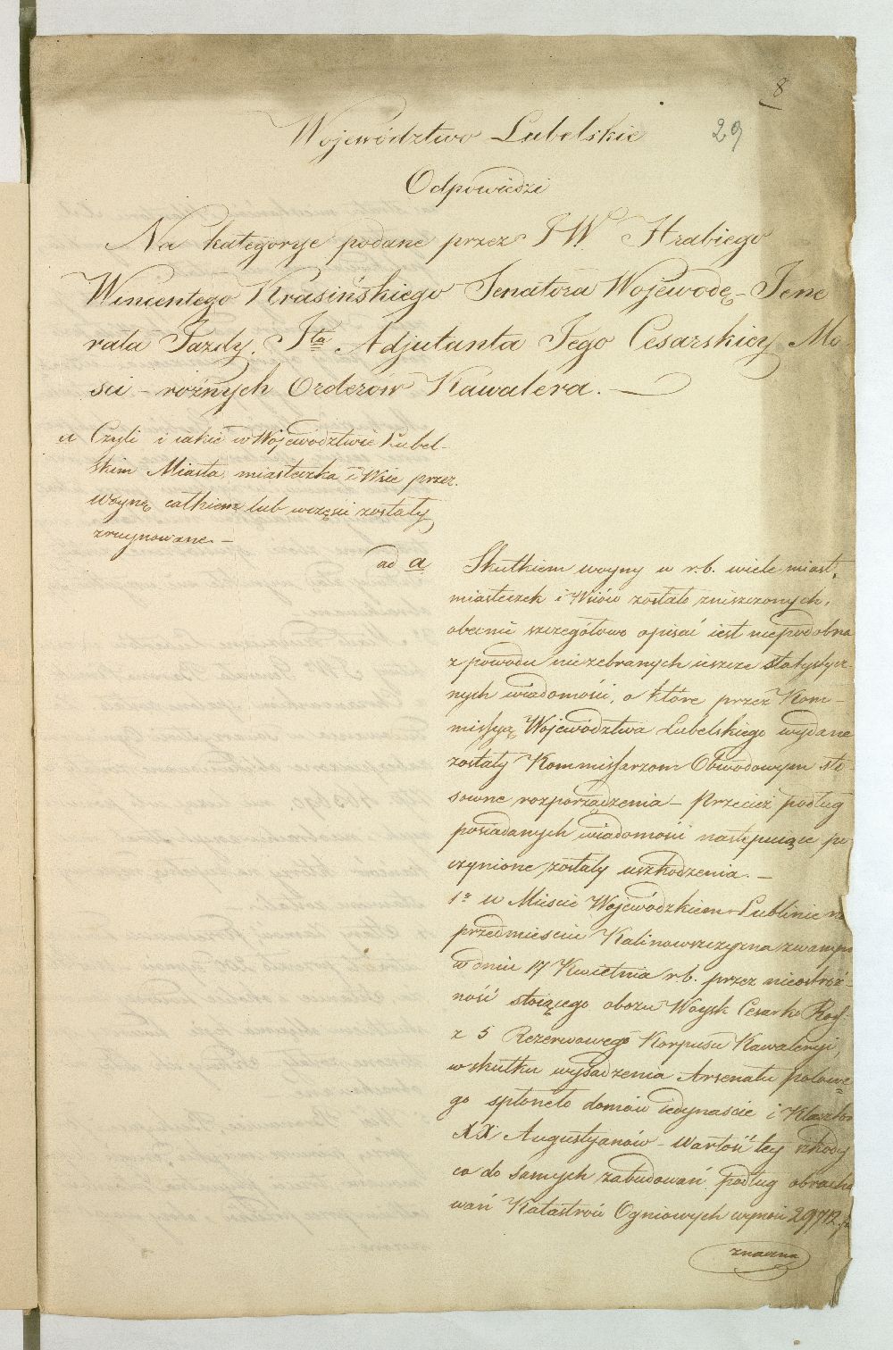 Po upadku powstania listopadowego, Rząd Tymczasowy Królestwa Polskiego, powołany we wrześniu 1831 r. przez cesarza Mikołaja I, polecił województwom przeprowadzenie lustracji oraz przygotowanie raportu o stanie poszczególnych obwodów. Do objazdu po kraju wyznaczono hr. Wincentego Krasińskiego (1782-1858), generała w czasie wojen napoleońskich i I. ordynata opinogórskiego, uczestnika wojen napoleońskich. Na dworze cesarza Napoleona zabiegał on o utworzenie polskiej jazdy, co w 1806 r. zaowocowało powstaniem 1. Pułku Szwoleżerów-Lansjerów Gwardii Cesarskiej. Uczestniczył w kampaniach 1806-1809, 1812-1814. Po abdykacji Napoleona (1814 r.) dowodził częścią wojska polskiego wracającego z Francji do kraju. Po 1815 r. kontynuował karierę, tak w wojsku, jak i w polityce. Od 1818 r. był marszałkiem Sejmu Królestwa Polskiego, od 1825 r. – senatorem-wojewodą; został szefem dywizji, a następnie gen. adiutantem cesarskim i dowódcą korpusu rezerwowego. W 1828 r., w czasie Sądu Sejmowego, jako jedyny spośród senatorów, głosował za ukaraniem członków Towarzystwa Patriotycznego oskarżonych o zdradę stanu. Będąc zwolennikiem współpracy i podporządkowania Polski cesarzowi, nie wziął udziału w powstaniu listopadowym. W Noc Listopadową towarzyszył w. ks. Konstantemu w Wierzbnie. Po stłumieniu powstania pełnił wysokie urzędy w administracji Królestwa Polskiego, będąc członkiem Rady Administracyjnej (1855-1856). Po śmierci Iwana Paskiewicza, od 1 II 1856 r. pełnił czasowo obowiązki namiestnika Królestwa. W 1844 r. ufundował Bibliotekę Ordynacji Krasińskich w Warszawie. Był odznaczony Legią Honorową, Orderem Orła Białego, Virtuti Militari, orderami: św. Stanisława, Aleksandra Newskiego, Anny i Włodzimierza. Krasińskiemu w objeździe po kraju miał towarzyszyć jeden urzędnik z danego województwa. Na podstawie reskryptu Komisji Rządowej Spraw Wewnętrznych i Policji z 14 XI 1831 r. przygotowano raport zatytułowany: „Województwo Lubelskie. Odpowiedzi na kategorie podane przez JW. Hrabiego Wincentego Krasińskiego Senatora Wojewodę-Generała Jazdy. Adiutanta Jego Cesarskiej Mości różnych orderów kawalera”. Kategorie pytań były następujące: stan zniszczeń w miastach, wsiach, fabrykach, rolnictwie, szkołach, rekwizycje, podatki, dobrowolne ofiary, stacjonowanie oddziałów partyzanckich, sądownictwo wojenne, tajne towarzystwa. Z opracowanego raportu wyłania się przygnębiający obraz województwa lubelskiego w ostatnich dniach 1831 r. Ciągłe przemarsze wojsk polskich i rosyjskich oraz działania wojenne spowodowały liczne zniszczenia w budynkach użyteczności publicznej i prywatnych oraz kościołach. W mieście wojewódzkim Lublinie na skutek wysadzenia arsenału polowego przez rosyjski 5. Rezerwowy Korpus Kawalerii spłonęło 11 domów oraz kościół i klasztor Augustianów. Inne miasta, jak Kazimierz, Markuszów, Grabowiec, Kurów uległy częściowemu zniszczeniu; Lubartów zaś spalono podczas bitwy gen. Cypriana Kreutza z gen. Wojciechem Chrzanowskim. Całkowitemu zniszczeniu uległy wsie: Bronowice, Biskupiec i Podgórz. Wieś Brodów całkowicie spalono w czasie ucieczki Korpusu Girolamo Ramorino (polski i włoski gen. dywizji) w kierunku granicy z Austrią. W marcu 1831 r. przez województwo przechodziły oddziały gen. Józefa Dwernickiego, w czerwcu gen. Wojciecha Chrzanowskiego w kierunku na Zamość, kapitana Józefa Giedrojcia (Oddział Strzelców Leśnych) kierujące się na Janów, gen. Ramorino (potyczki z Korpusem Theodora Rüdigiera, gen. rosyjskiego). W czasie przemarszu gen. Chrzanowski pobrał z Kasy Miejskiej Lublina 10945 złp., a z Kasy Głównej Województwa 2000 złp. Sumy te przeznaczył na potrzeby Korpusu. Ramorino podczas marszu do Galicji nakładał na ludność kontrybucje i niszczył okolice. Na podstawie wizji lokalnej i dowodów znajdujących się w Archiwum Komisji Województwa Lubelskiego całkowity wykaz szkód w gotówce wyniósł ponad 3 mln. złp. Z akt pozostałych po Rządzie Rewolucyjnym wynikało, że spore sumy przeznaczono na zaopatrzenie Twierdzy Zamość w zboże, mięso, furaż oraz drewno. Na podstawie postanowienia Rządu Tymczasowego z 18 XII 1830 r., intendent generalny wojskowy zarządził dostawy do magazynów województwa (Lublin, Kazimierz, Puławy, Krasnystaw), a ustanowienie Komitetów Żywności pozwoliło na ustalenie cen średnich na produkty rolne oraz rozłożenie dostaw w powiatach. Dodatkowo postanowieniem Rządu Tymczasowego z 13 grudnia, uzupełnionym reskryptem Rządu Narodowego z 17 II 1831 r., nałożono na województwo obowiązek dostarczenia jeźdźców z każdych 50 dymów, z koniem, ubiorem i uzbrojeniem. Natomiast w reskrypcie Komisji Rządowej Spraw Wewnętrznych z 27 XI 1830 r. zalecono gminom starozakonnym dostarczenie określonej ilości kożuchów. Zarówno duchowieństwo, jak i właściciele dóbr i włościanie oraz Żydzi byli zobowiązani do przekazania określonej sumy, jako ofiary na cele powstania. Dobrowolną ofiarę, w wysokości jednego miliona złp., przekazał hr. Konstanty Zamoyski. Była ona przeznaczona na utworzenie Pułku Jazdy. Stan rolnictwa był opłakany, magazyny zboża opustoszałe, włościanie oderwani od żniw w związku z powołaniem pospolitego ruszenia, zniszczone pola uprawne (przemarsz wojsk) od Kocka do ujścia Wieprza do Wisły oraz wzdłuż traktów drogowych do Puław, Lublina, Włodawy, Lubartowa, Krasnegostawu, Zamościa. Zanotowano też liczne straty w fabrykach: w Janowie w fabryce sukna, Biłgoraju - fabryce sit, w Sernikach - fabryce bawełny. W miastach szkoły i pensje funkcjonowały w zasadzie bez przeszkód. Niektóre z nich były okresowo zajęte na lazarety, magazyny, tymczasowe areszty, sądy wojenne (Opole, Hrubieszów, Lublin). Sąd Wojenny w Twierdzy Zamość osądził kilka osób (niewiadomego nazwiska) za szpiegostwo; na sześciu Żydów wydał wyrok śmierci. W Lublinie ro