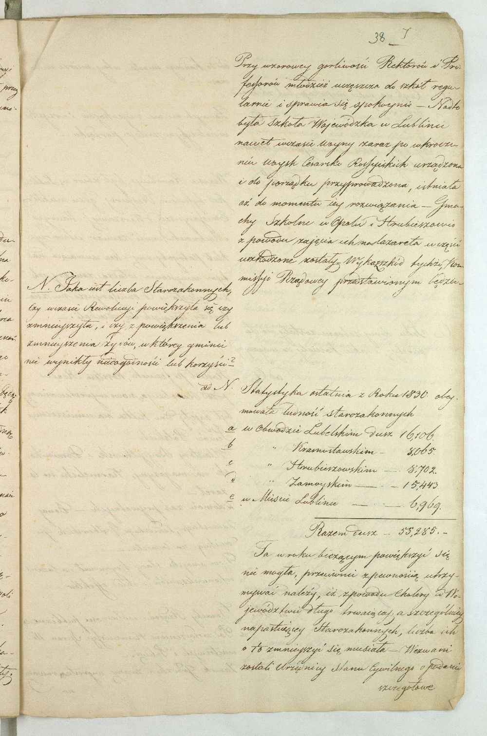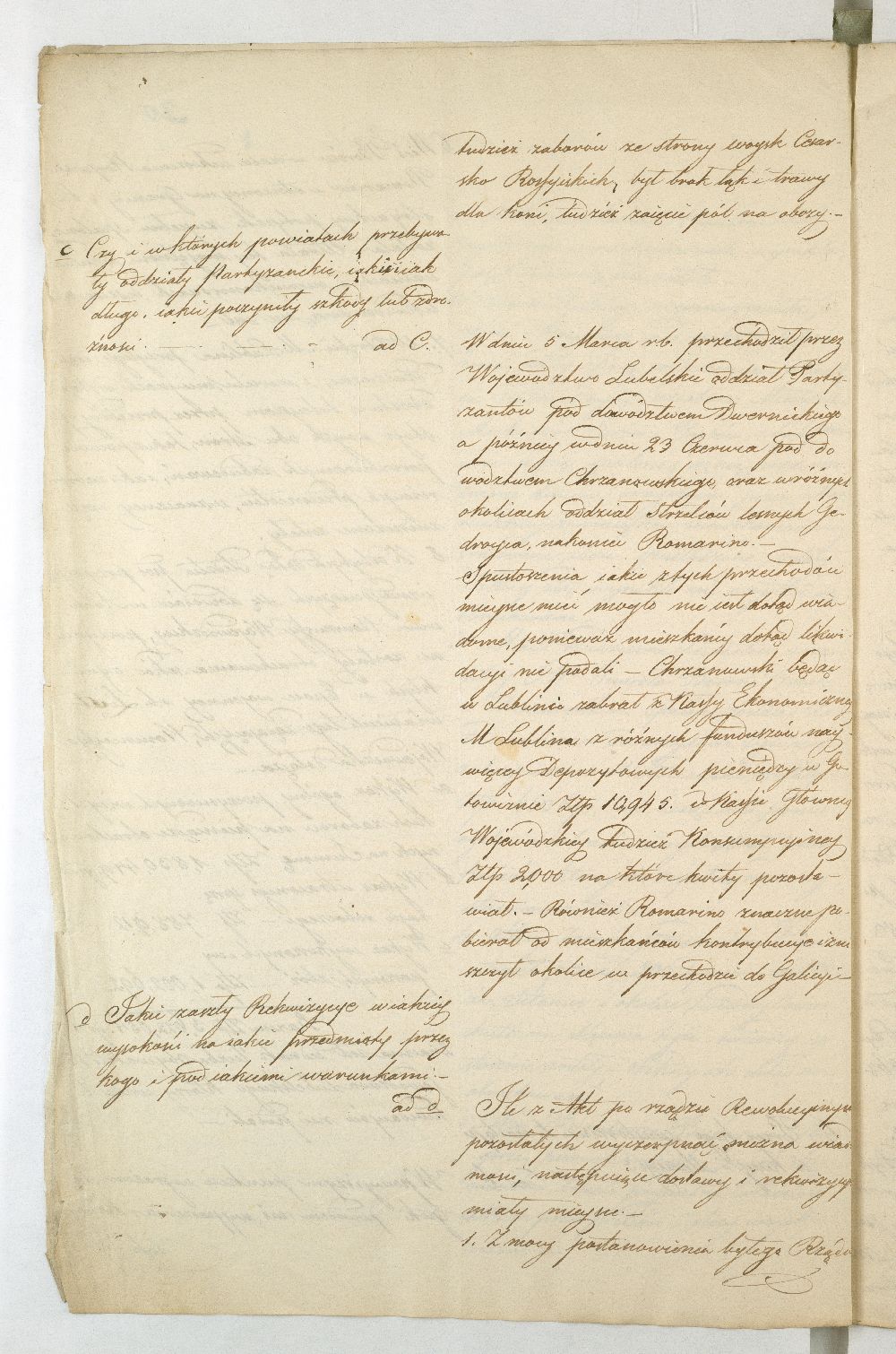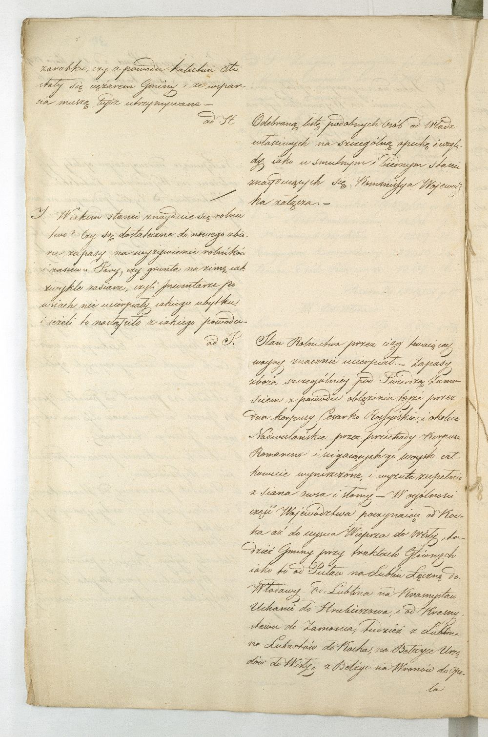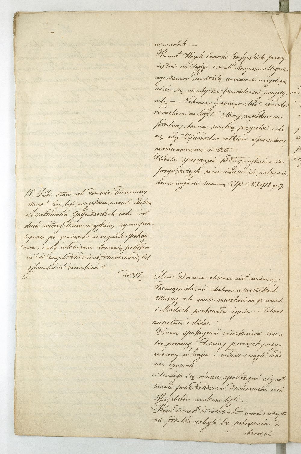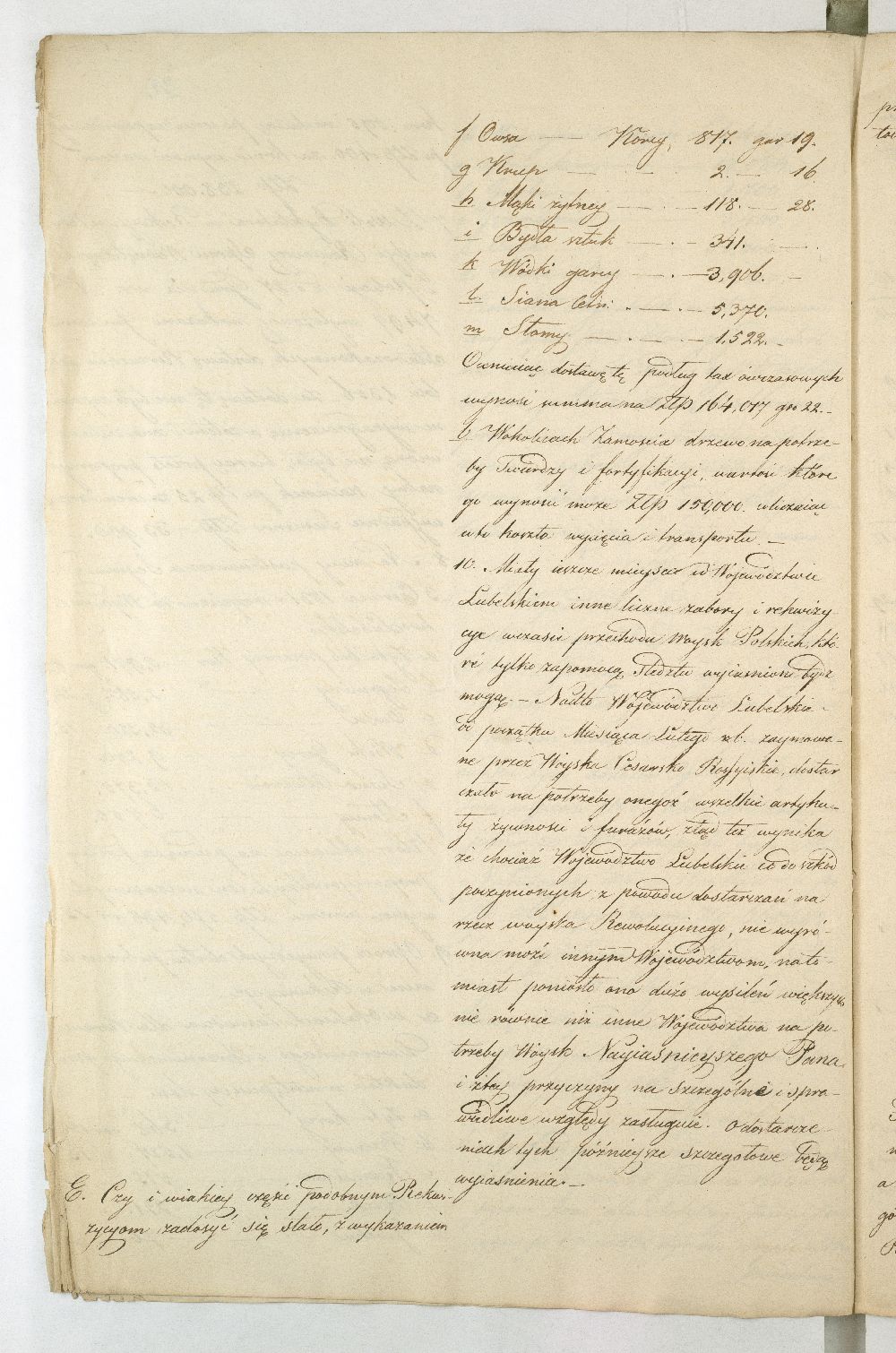 Po upadku powstania listopadowego, Rząd Tymczasowy Królestwa Polskiego, powołany we wrześniu 1831 r. przez cesarza Mikołaja I, polecił województwom przeprowadzenie lustracji oraz przygotowanie raportu o stanie poszczególnych obwodów. Do objazdu po kraju wyznaczono hr. Wincentego Krasińskiego (1782-1858), generała w czasie wojen napoleońskich i I. ordynata opinogórskiego, uczestnika wojen napoleońskich. Na dworze cesarza Napoleona zabiegał on o utworzenie polskiej jazdy, co w 1806 r. zaowocowało powstaniem 1. Pułku Szwoleżerów-Lansjerów Gwardii Cesarskiej. Uczestniczył w kampaniach 1806-1809, 1812-1814. Po abdykacji Napoleona (1814 r.) dowodził częścią wojska polskiego wracającego z Francji do kraju. Po 1815 r. kontynuował karierę, tak w wojsku, jak i w polityce. Od 1818 r. był marszałkiem Sejmu Królestwa Polskiego, od 1825 r. – senatorem-wojewodą; został szefem dywizji, a następnie gen. adiutantem cesarskim i dowódcą korpusu rezerwowego. W 1828 r., w czasie Sądu Sejmowego, jako jedyny spośród senatorów, głosował za ukaraniem członków Towarzystwa Patriotycznego oskarżonych o zdradę stanu. Będąc zwolennikiem współpracy i podporządkowania Polski cesarzowi, nie wziął udziału w powstaniu listopadowym. W Noc Listopadową towarzyszył w. ks. Konstantemu w Wierzbnie. Po stłumieniu powstania pełnił wysokie urzędy w administracji Królestwa Polskiego, będąc członkiem Rady Administracyjnej (1855-1856). Po śmierci Iwana Paskiewicza, od 1 II 1856 r. pełnił czasowo obowiązki namiestnika Królestwa. W 1844 r. ufundował Bibliotekę Ordynacji Krasińskich w Warszawie. Był odznaczony Legią Honorową, Orderem Orła Białego, Virtuti Militari, orderami: św. Stanisława, Aleksandra Newskiego, Anny i Włodzimierza. Krasińskiemu w objeździe po kraju miał towarzyszyć jeden urzędnik z danego województwa. Na podstawie reskryptu Komisji Rządowej Spraw Wewnętrznych i Policji z 14 XI 1831 r. przygotowano raport zatytułowany: „Województwo Lubelskie. Odpowiedzi na kategorie podane przez JW. Hrabiego Wincentego Krasińskiego Senatora Wojewodę-Generała Jazdy. Adiutanta Jego Cesarskiej Mości różnych orderów kawalera”. Kategorie pytań były następujące: stan zniszczeń w miastach, wsiach, fabrykach, rolnictwie, szkołach, rekwizycje, podatki, dobrowolne ofiary, stacjonowanie oddziałów partyzanckich, sądownictwo wojenne, tajne towarzystwa. Z opracowanego raportu wyłania się przygnębiający obraz województwa lubelskiego w ostatnich dniach 1831 r. Ciągłe przemarsze wojsk polskich i rosyjskich oraz działania wojenne spowodowały liczne zniszczenia w budynkach użyteczności publicznej i prywatnych oraz kościołach. W mieście wojewódzkim Lublinie na skutek wysadzenia arsenału polowego przez rosyjski 5. Rezerwowy Korpus Kawalerii spłonęło 11 domów oraz kościół i klasztor Augustianów. Inne miasta, jak Kazimierz, Markuszów, Grabowiec, Kurów uległy częściowemu zniszczeniu; Lubartów zaś spalono podczas bitwy gen. Cypriana Kreutza z gen. Wojciechem Chrzanowskim. Całkowitemu zniszczeniu uległy wsie: Bronowice, Biskupiec i Podgórz. Wieś Brodów całkowicie spalono w czasie ucieczki Korpusu Girolamo Ramorino (polski i włoski gen. dywizji) w kierunku granicy z Austrią. W marcu 1831 r. przez województwo przechodziły oddziały gen. Józefa Dwernickiego, w czerwcu gen. Wojciecha Chrzanowskiego w kierunku na Zamość, kapitana Józefa Giedrojcia (Oddział Strzelców Leśnych) kierujące się na Janów, gen. Ramorino (potyczki z Korpusem Theodora Rüdigiera, gen. rosyjskiego). W czasie przemarszu gen. Chrzanowski pobrał z Kasy Miejskiej Lublina 10945 złp., a z Kasy Głównej Województwa 2000 złp. Sumy te przeznaczył na potrzeby Korpusu. Ramorino podczas marszu do Galicji nakładał na ludność kontrybucje i niszczył okolice. Na podstawie wizji lokalnej i dowodów znajdujących się w Archiwum Komisji Województwa Lubelskiego całkowity wykaz szkód w gotówce wyniósł ponad 3 mln. złp. Z akt pozostałych po Rządzie Rewolucyjnym wynikało, że spore sumy przeznaczono na zaopatrzenie Twierdzy Zamość w zboże, mięso, furaż oraz drewno. Na podstawie postanowienia Rządu Tymczasowego z 18 XII 1830 r., intendent generalny wojskowy zarządził dostawy do magazynów województwa (Lublin, Kazimierz, Puławy, Krasnystaw), a ustanowienie Komitetów Żywności pozwoliło na ustalenie cen średnich na produkty rolne oraz rozłożenie dostaw w powiatach. Dodatkowo postanowieniem Rządu Tymczasowego z 13 grudnia, uzupełnionym reskryptem Rządu Narodowego z 17 II 1831 r., nałożono na województwo obowiązek dostarczenia jeźdźców z każdych 50 dymów, z koniem, ubiorem i uzbrojeniem. Natomiast w reskrypcie Komisji Rządowej Spraw Wewnętrznych z 27 XI 1830 r. zalecono gminom starozakonnym dostarczenie określonej ilości kożuchów. Zarówno duchowieństwo, jak i właściciele dóbr i włościanie oraz Żydzi byli zobowiązani do przekazania określonej sumy, jako ofiary na cele powstania. Dobrowolną ofiarę, w wysokości jednego miliona złp., przekazał hr. Konstanty Zamoyski. Była ona przeznaczona na utworzenie Pułku Jazdy. Stan rolnictwa był opłakany, magazyny zboża opustoszałe, włościanie oderwani od żniw w związku z powołaniem pospolitego ruszenia, zniszczone pola uprawne (przemarsz wojsk) od Kocka do ujścia Wieprza do Wisły oraz wzdłuż traktów drogowych do Puław, Lublina, Włodawy, Lubartowa, Krasnegostawu, Zamościa. Zanotowano też liczne straty w fabrykach: w Janowie w fabryce sukna, Biłgoraju - fabryce sit, w Sernikach - fabryce bawełny. W miastach szkoły i pensje funkcjonowały w zasadzie bez przeszkód. Niektóre z nich były okresowo zajęte na lazarety, magazyny, tymczasowe areszty, sądy wojenne (Opole, Hrubieszów, Lublin). Sąd Wojenny w Twierdzy Zamość osądził kilka osób (niewiadomego nazwiska) za szpiegostwo; na sześciu Żydów wydał wyrok śmierci. W Lublinie ro
