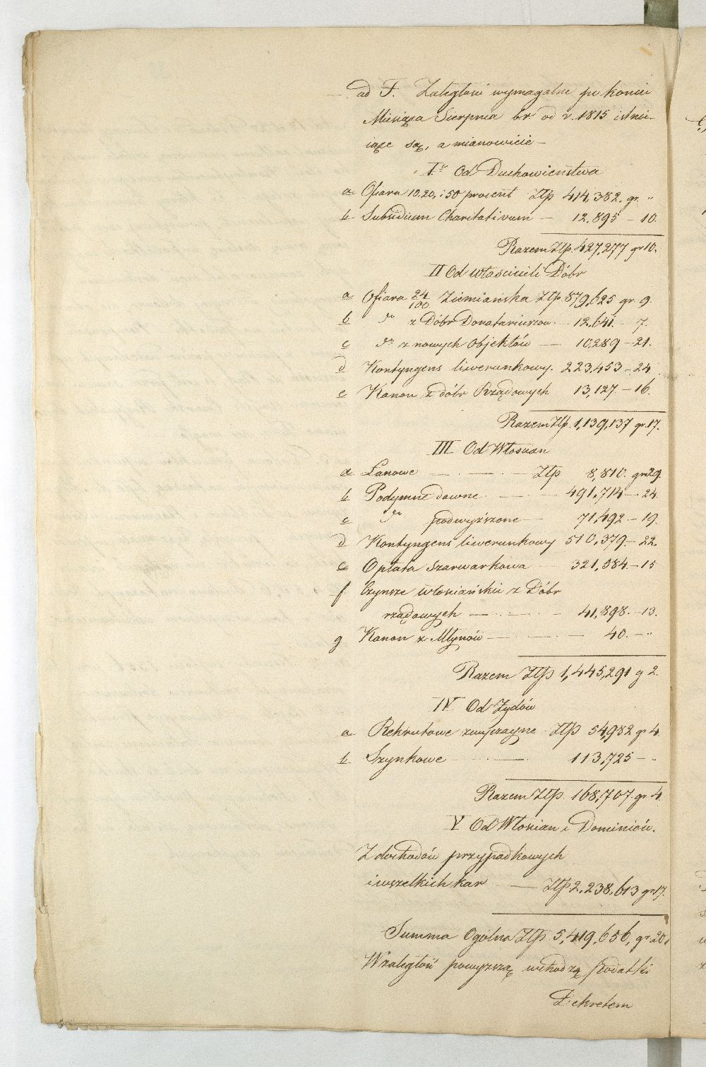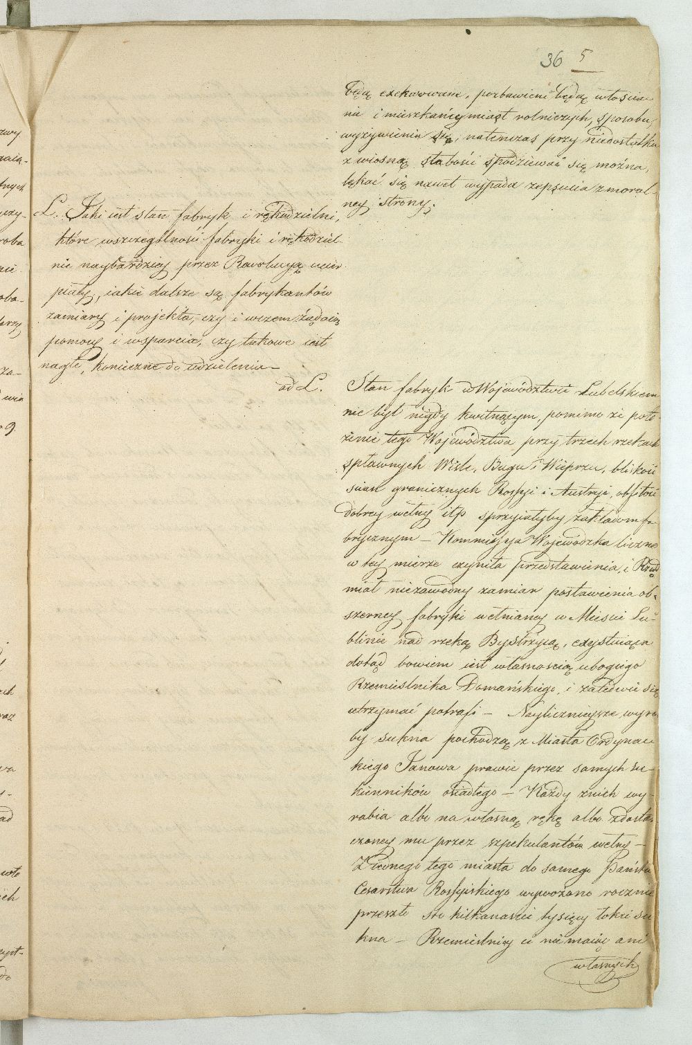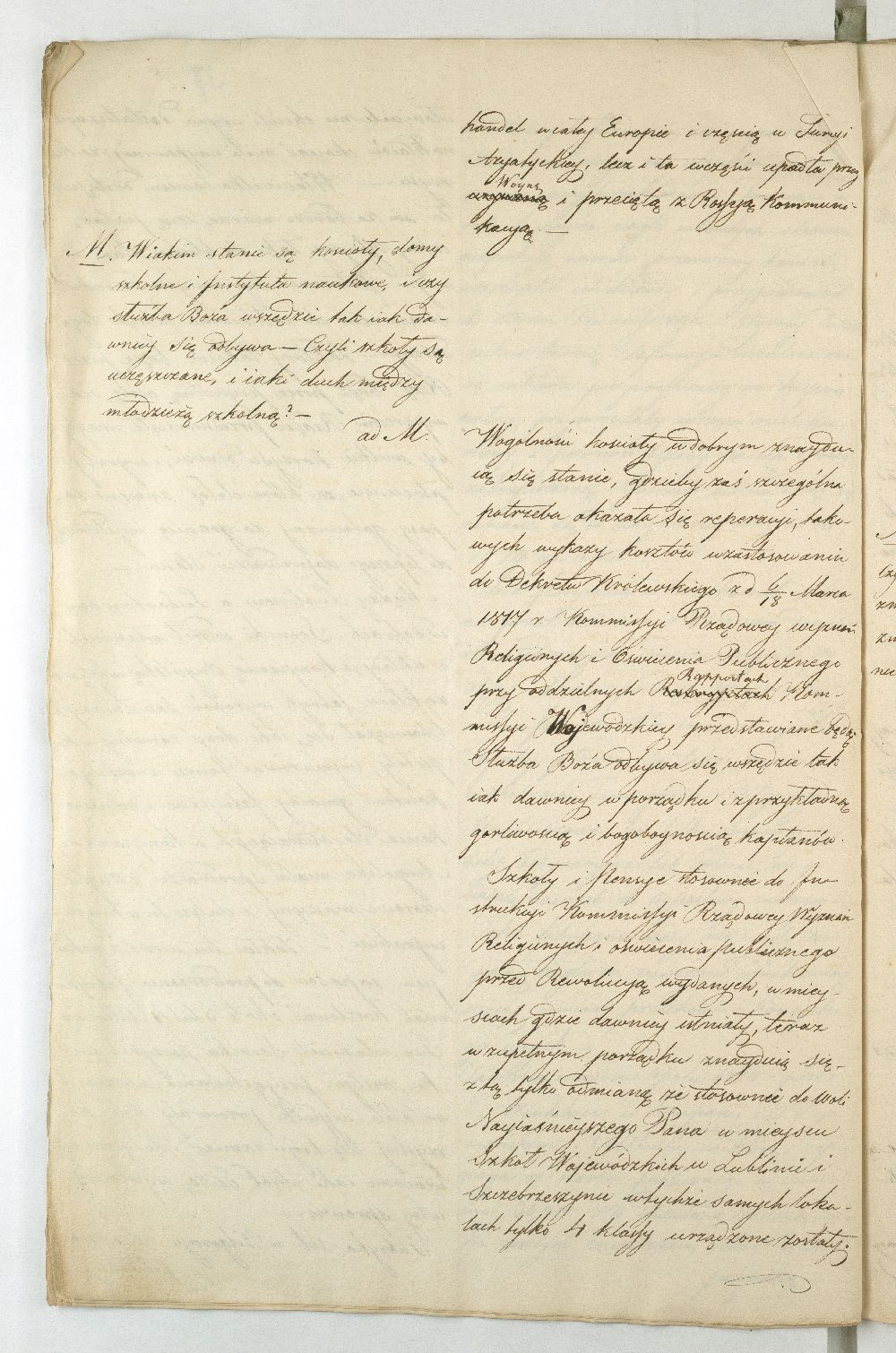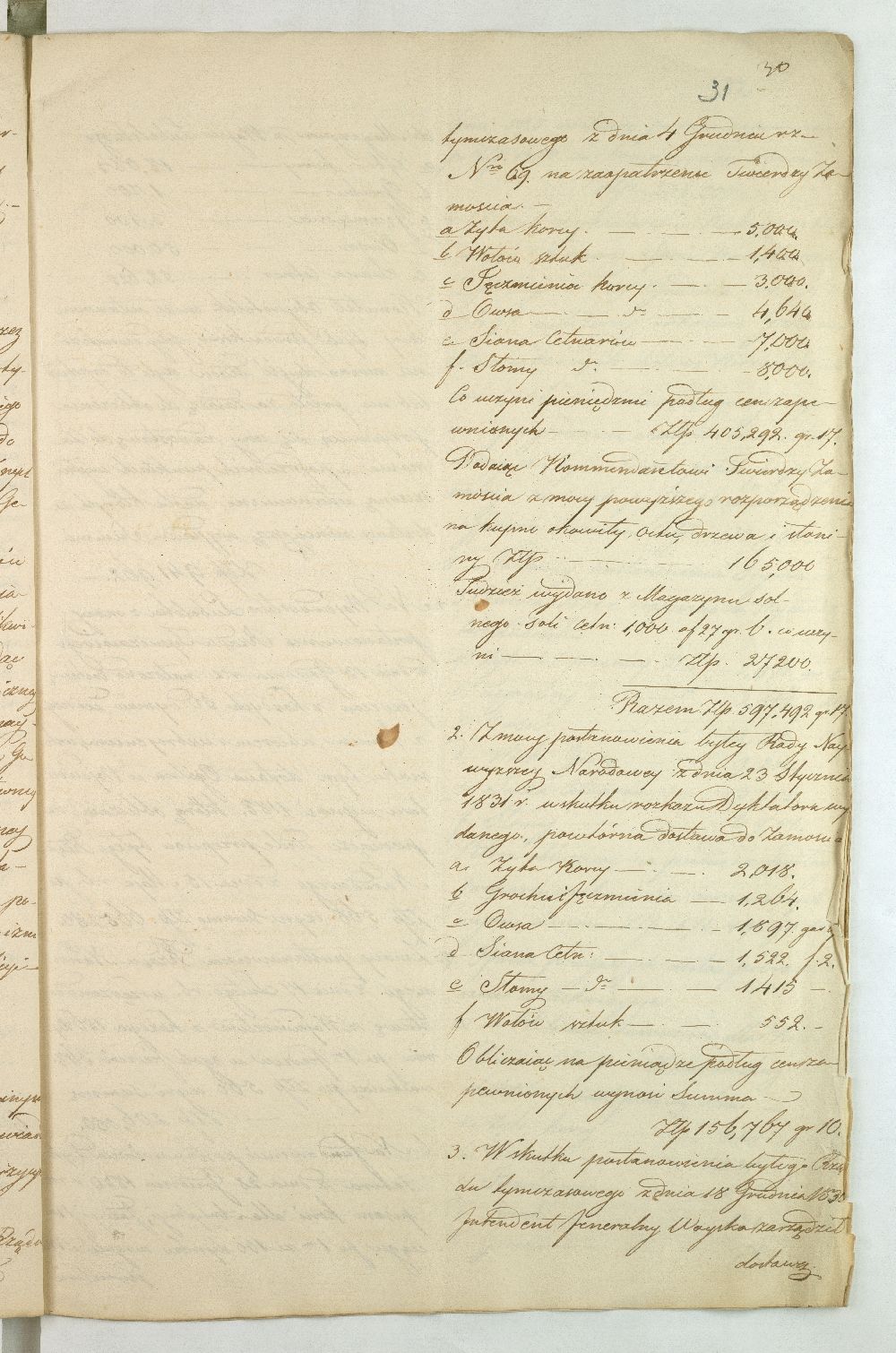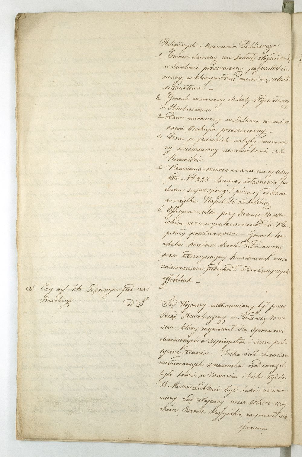 Po upadku powstania listopadowego, Rząd Tymczasowy Królestwa Polskiego, powołany we wrześniu 1831 r. przez cesarza Mikołaja I, polecił województwom przeprowadzenie lustracji oraz przygotowanie raportu o stanie poszczególnych obwodów. Do objazdu po kraju wyznaczono hr. Wincentego Krasińskiego (1782-1858), generała w czasie wojen napoleońskich i I. ordynata opinogórskiego, uczestnika wojen napoleońskich. Na dworze cesarza Napoleona zabiegał on o utworzenie polskiej jazdy, co w 1806 r. zaowocowało powstaniem 1. Pułku Szwoleżerów-Lansjerów Gwardii Cesarskiej. Uczestniczył w kampaniach 1806-1809, 1812-1814. Po abdykacji Napoleona (1814 r.) dowodził częścią wojska polskiego wracającego z Francji do kraju. Po 1815 r. kontynuował karierę, tak w wojsku, jak i w polityce. Od 1818 r. był marszałkiem Sejmu Królestwa Polskiego, od 1825 r. – senatorem-wojewodą; został szefem dywizji, a następnie gen. adiutantem cesarskim i dowódcą korpusu rezerwowego. W 1828 r., w czasie Sądu Sejmowego, jako jedyny spośród senatorów, głosował za ukaraniem członków Towarzystwa Patriotycznego oskarżonych o zdradę stanu. Będąc zwolennikiem współpracy i podporządkowania Polski cesarzowi, nie wziął udziału w powstaniu listopadowym. W Noc Listopadową towarzyszył w. ks. Konstantemu w Wierzbnie. Po stłumieniu powstania pełnił wysokie urzędy w administracji Królestwa Polskiego, będąc członkiem Rady Administracyjnej (1855-1856). Po śmierci Iwana Paskiewicza, od 1 II 1856 r. pełnił czasowo obowiązki namiestnika Królestwa. W 1844 r. ufundował Bibliotekę Ordynacji Krasińskich w Warszawie. Był odznaczony Legią Honorową, Orderem Orła Białego, Virtuti Militari, orderami: św. Stanisława, Aleksandra Newskiego, Anny i Włodzimierza. Krasińskiemu w objeździe po kraju miał towarzyszyć jeden urzędnik z danego województwa. Na podstawie reskryptu Komisji Rządowej Spraw Wewnętrznych i Policji z 14 XI 1831 r. przygotowano raport zatytułowany: „Województwo Lubelskie. Odpowiedzi na kategorie podane przez JW. Hrabiego Wincentego Krasińskiego Senatora Wojewodę-Generała Jazdy. Adiutanta Jego Cesarskiej Mości różnych orderów kawalera”. Kategorie pytań były następujące: stan zniszczeń w miastach, wsiach, fabrykach, rolnictwie, szkołach, rekwizycje, podatki, dobrowolne ofiary, stacjonowanie oddziałów partyzanckich, sądownictwo wojenne, tajne towarzystwa. Z opracowanego raportu wyłania się przygnębiający obraz województwa lubelskiego w ostatnich dniach 1831 r. Ciągłe przemarsze wojsk polskich i rosyjskich oraz działania wojenne spowodowały liczne zniszczenia w budynkach użyteczności publicznej i prywatnych oraz kościołach. W mieście wojewódzkim Lublinie na skutek wysadzenia arsenału polowego przez rosyjski 5. Rezerwowy Korpus Kawalerii spłonęło 11 domów oraz kościół i klasztor Augustianów. Inne miasta, jak Kazimierz, Markuszów, Grabowiec, Kurów uległy częściowemu zniszczeniu; Lubartów zaś spalono podczas bitwy gen. Cypriana Kreutza z gen. Wojciechem Chrzanowskim. Całkowitemu zniszczeniu uległy wsie: Bronowice, Biskupiec i Podgórz. Wieś Brodów całkowicie spalono w czasie ucieczki Korpusu Girolamo Ramorino (polski i włoski gen. dywizji) w kierunku granicy z Austrią. W marcu 1831 r. przez województwo przechodziły oddziały gen. Józefa Dwernickiego, w czerwcu gen. Wojciecha Chrzanowskiego w kierunku na Zamość, kapitana Józefa Giedrojcia (Oddział Strzelców Leśnych) kierujące się na Janów, gen. Ramorino (potyczki z Korpusem Theodora Rüdigiera, gen. rosyjskiego). W czasie przemarszu gen. Chrzanowski pobrał z Kasy Miejskiej Lublina 10945 złp., a z Kasy Głównej Województwa 2000 złp. Sumy te przeznaczył na potrzeby Korpusu. Ramorino podczas marszu do Galicji nakładał na ludność kontrybucje i niszczył okolice. Na podstawie wizji lokalnej i dowodów znajdujących się w Archiwum Komisji Województwa Lubelskiego całkowity wykaz szkód w gotówce wyniósł ponad 3 mln. złp. Z akt pozostałych po Rządzie Rewolucyjnym wynikało, że spore sumy przeznaczono na zaopatrzenie Twierdzy Zamość w zboże, mięso, furaż oraz drewno. Na podstawie postanowienia Rządu Tymczasowego z 18 XII 1830 r., intendent generalny wojskowy zarządził dostawy do magazynów województwa (Lublin, Kazimierz, Puławy, Krasnystaw), a ustanowienie Komitetów Żywności pozwoliło na ustalenie cen średnich na produkty rolne oraz rozłożenie dostaw w powiatach. Dodatkowo postanowieniem Rządu Tymczasowego z 13 grudnia, uzupełnionym reskryptem Rządu Narodowego z 17 II 1831 r., nałożono na województwo obowiązek dostarczenia jeźdźców z każdych 50 dymów, z koniem, ubiorem i uzbrojeniem. Natomiast w reskrypcie Komisji Rządowej Spraw Wewnętrznych z 27 XI 1830 r. zalecono gminom starozakonnym dostarczenie określonej ilości kożuchów. Zarówno duchowieństwo, jak i właściciele dóbr i włościanie oraz Żydzi byli zobowiązani do przekazania określonej sumy, jako ofiary na cele powstania. Dobrowolną ofiarę, w wysokości jednego miliona złp., przekazał hr. Konstanty Zamoyski. Była ona przeznaczona na utworzenie Pułku Jazdy. Stan rolnictwa był opłakany, magazyny zboża opustoszałe, włościanie oderwani od żniw w związku z powołaniem pospolitego ruszenia, zniszczone pola uprawne (przemarsz wojsk) od Kocka do ujścia Wieprza do Wisły oraz wzdłuż traktów drogowych do Puław, Lublina, Włodawy, Lubartowa, Krasnegostawu, Zamościa. Zanotowano też liczne straty w fabrykach: w Janowie w fabryce sukna, Biłgoraju - fabryce sit, w Sernikach - fabryce bawełny. W miastach szkoły i pensje funkcjonowały w zasadzie bez przeszkód. Niektóre z nich były okresowo zajęte na lazarety, magazyny, tymczasowe areszty, sądy wojenne (Opole, Hrubieszów, Lublin). Sąd Wojenny w Twierdzy Zamość osądził kilka osób (niewiadomego nazwiska) za szpiegostwo; na sześciu Żydów wydał wyrok śmierci. W Lublinie ro