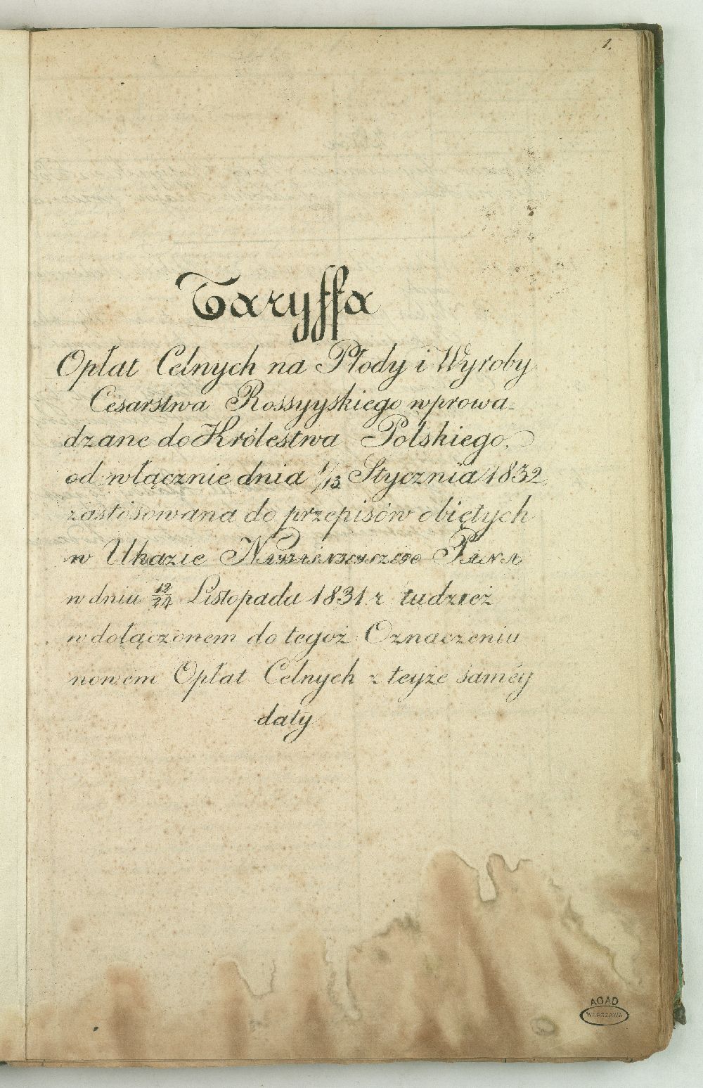 Opis zewnętrzny | Litografia, rkps; jęz. polski; karty papierowe w księdze: „Taryffa opłat celnych pomiędzy Rosją a Polską obowiązująca od dnia 11/29 listopada 1831 r.”. |
