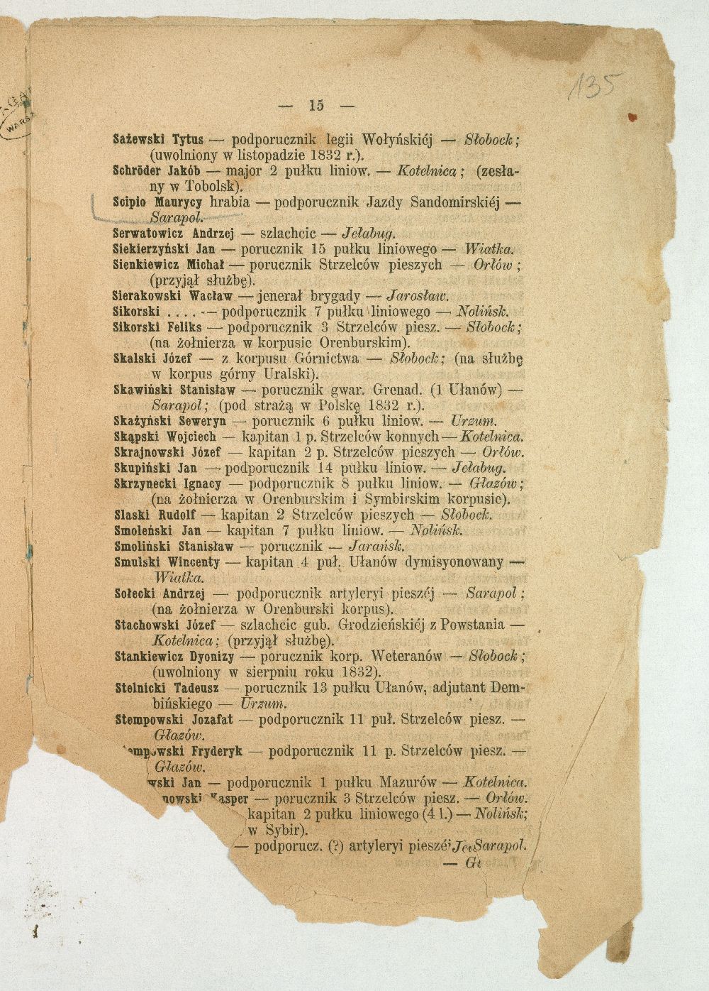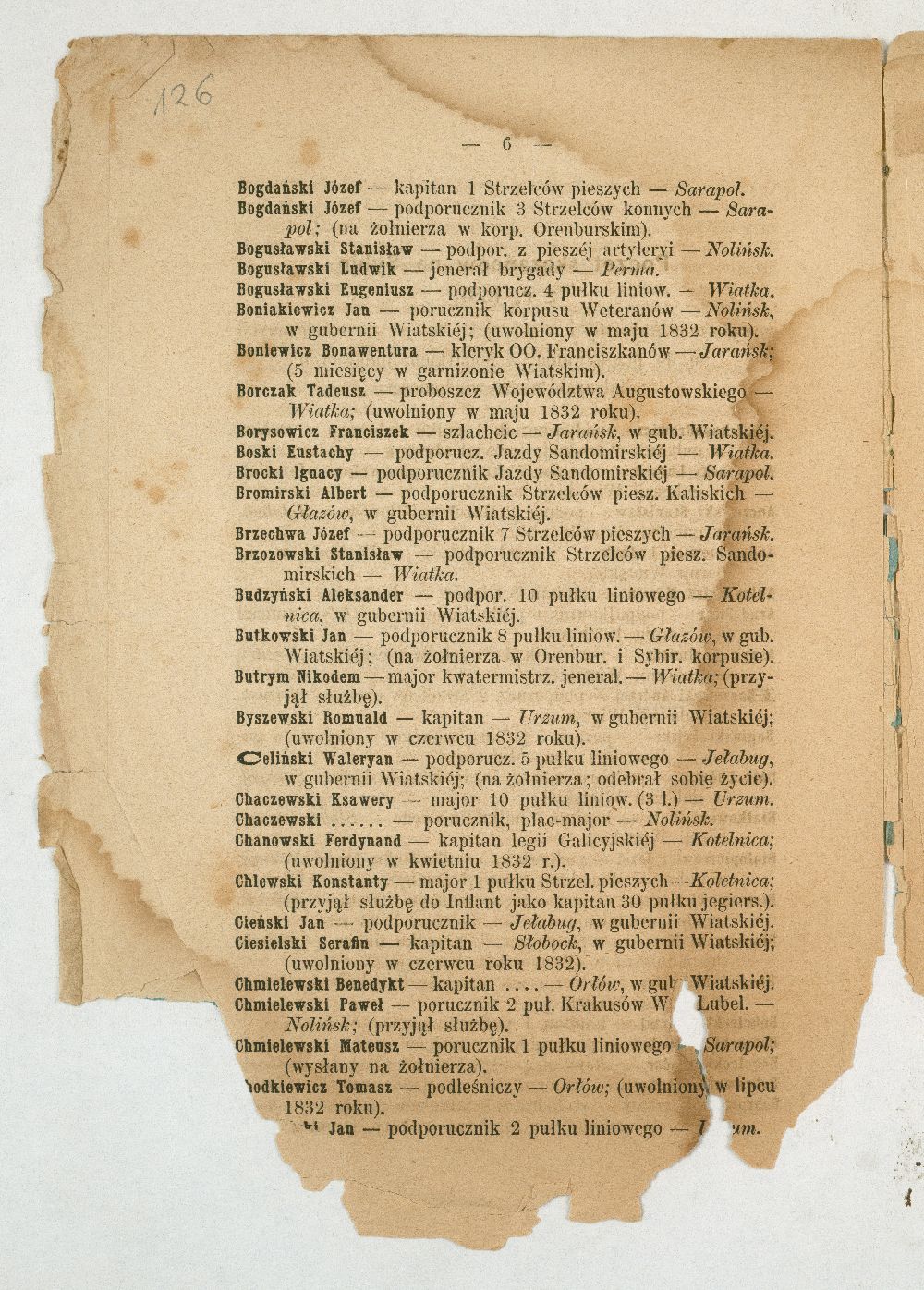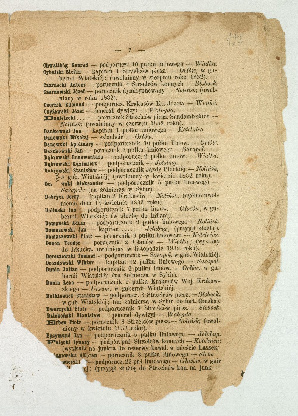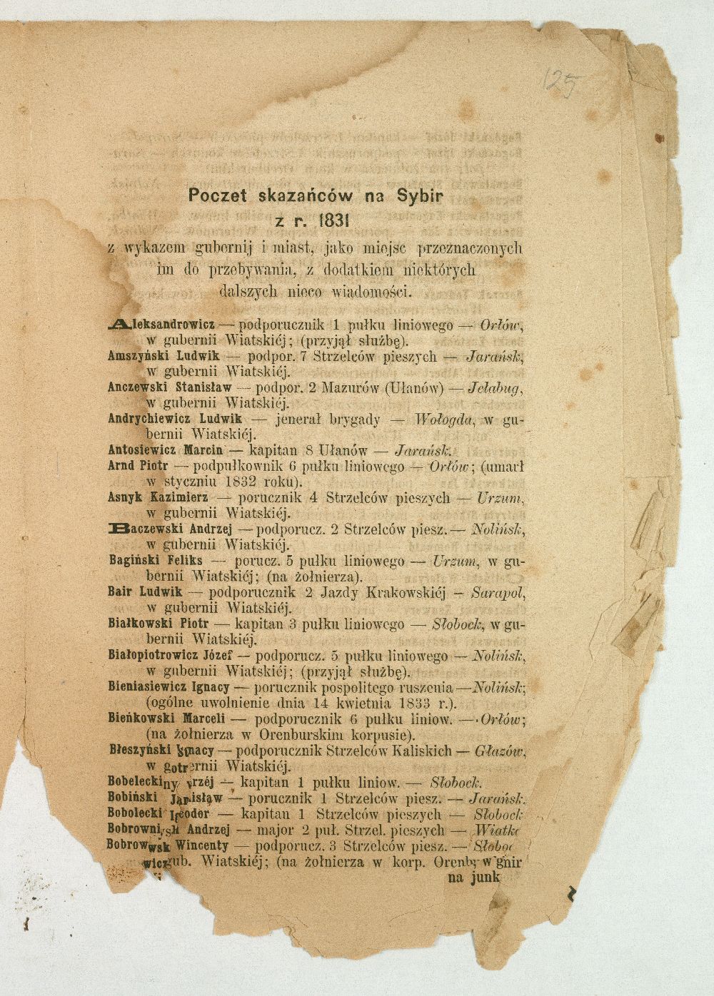 Po upadku powstania listopadowego władze carskie ogłosiły amnestię, jednak faktycznie tysiące jego uczestników zostały wcielone karnie do wojsk odbywających służbę w głębi Rosji, głównie na Kaukazie. Z amnestii wyłączeni byli organizatorzy i uczestnicy Nocy Listopadowej oraz przywódcy powstania, a przede wszystkim żołnierze pochodzący z Litwy, Białorusi i Ukrainy. Wielu wyższych rangą oficerów i dowódców trafiło na zesłanie do guberni wiatskiej, ze stolicą w Wiatce, nad rzeką o tej samej nazwie (miasto, obecnie w europejskiej części Rosji, w latach 1457-1781 nazywało się Chłynów, następnie Wiatka, a od 1934 r. Kirów). Broszura, wydana w Krakowie dla upamiętnienia zesłańców, zawiera blisko pół tysiąca nazwisk w układzie alfabetycznym wraz z informacją, dokąd dalej mieli udać się skazańcy. Najczęściej powtarzającymi się miejscami były: Perm - miasto założone w XVIII w. nad rzeką Kamą u stóp Uralu, Jarosław - miasto nad górną Wołgą, Wołogda - miasto nad Wołogdą, dopływem Dźwiny oraz Kostroma - port nad Wołgą, przy ujściu rzeki Kostromy. Do Permu skierowano generałów brygady: Ludwika Bogusławskiego, Bonifacego Jagmina, Jana Mullera i Karola Turno. Do Jarosławia - gen. bryg. ks. Michała Gedeona Radziwiłła, gen. broni Wacława Sierakowskiego, barona Jana Krukowieckiego (później przeniesiony do Wołogdy) i gen. dyw. Edwarda Żółtowskiego. Do Wołogdy odesłano generałów dywizji: Józefa Czyżewskiego, Kazimierza (w druku: „Stanisława”) Dziekońskiego, Franciszka Morawskiego, Tomasza Mrozińskiego, Jana Mulberga, Franciszka Ksawerego (w druku: „Józefa”) Niesiołowskiego, Jana Redela, Jana Tomickiego, generałów bryg. Klemensa Kołaczkowskiego, Ignacego Prądzyńskiego, Franciszka Rohlanda oraz gen. broni Izydora Krasińskiego. Do Kostromy odesłano generałów dyw. Jana Klickiego i Jana Weyssenhoffa. Wzmianki o zesłaniu do Wiatki można spotkać w bogatej literaturze pamiętnikarskiej XIX w. |