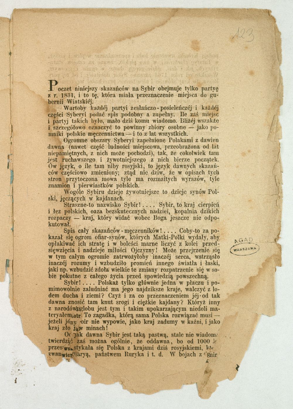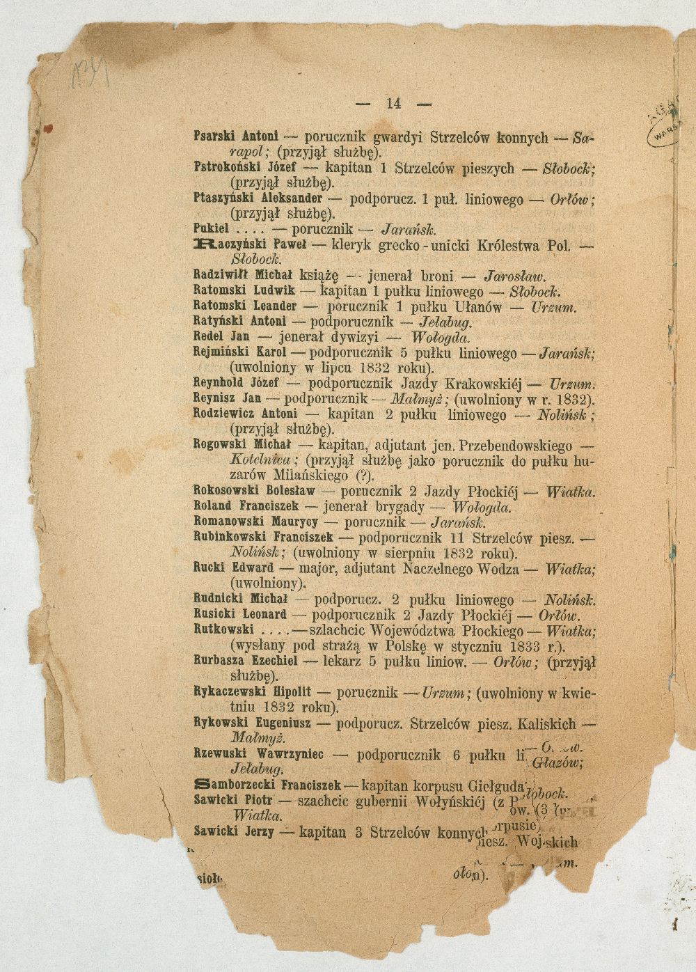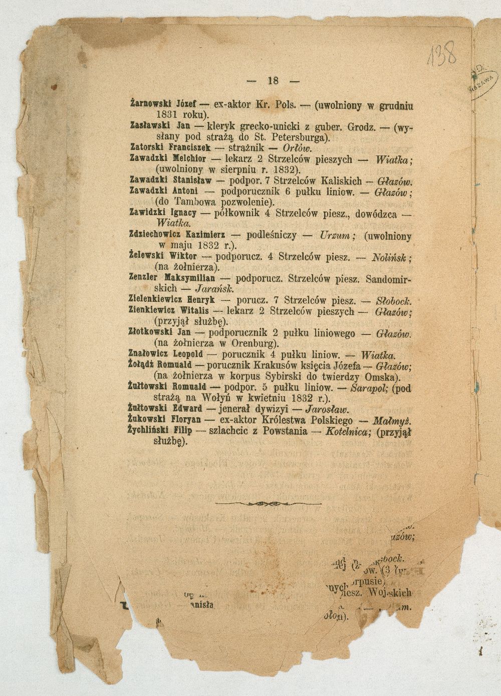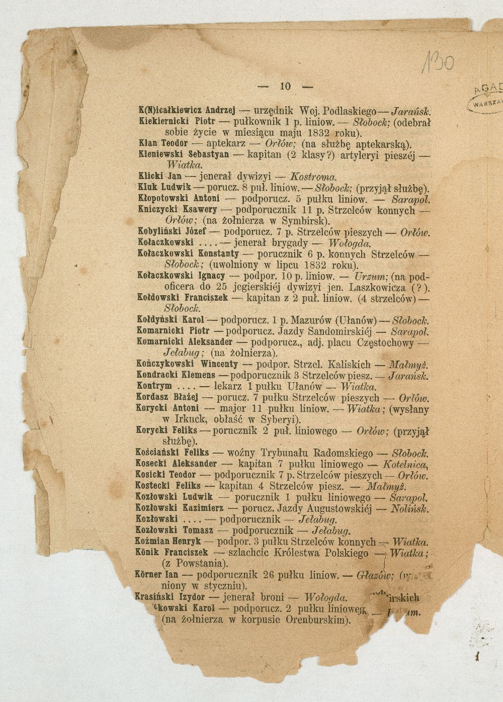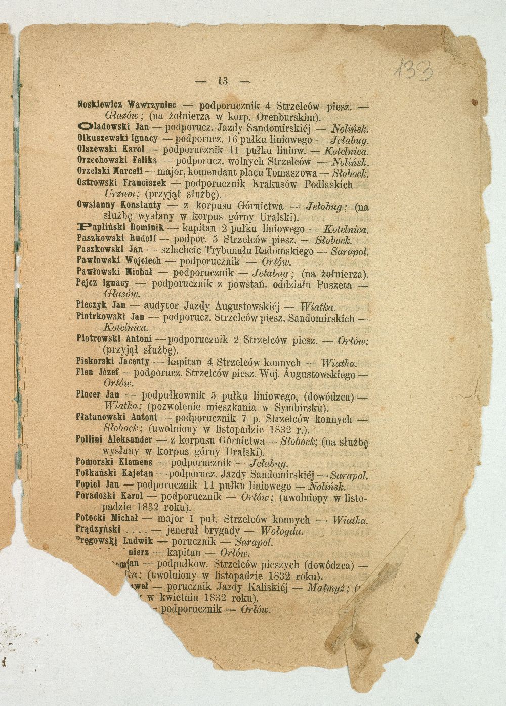 Po upadku powstania listopadowego władze carskie ogłosiły amnestię, jednak faktycznie tysiące jego uczestników zostały wcielone karnie do wojsk odbywających służbę w głębi Rosji, głównie na Kaukazie. Z amnestii wyłączeni byli organizatorzy i uczestnicy Nocy Listopadowej oraz przywódcy powstania, a przede wszystkim żołnierze pochodzący z Litwy, Białorusi i Ukrainy. Wielu wyższych rangą oficerów i dowódców trafiło na zesłanie do guberni wiatskiej, ze stolicą w Wiatce, nad rzeką o tej samej nazwie (miasto, obecnie w europejskiej części Rosji, w latach 1457-1781 nazywało się Chłynów, następnie Wiatka, a od 1934 r. Kirów). Broszura, wydana w Krakowie dla upamiętnienia zesłańców, zawiera blisko pół tysiąca nazwisk w układzie alfabetycznym wraz z informacją, dokąd dalej mieli udać się skazańcy. Najczęściej powtarzającymi się miejscami były: Perm - miasto założone w XVIII w. nad rzeką Kamą u stóp Uralu, Jarosław - miasto nad górną Wołgą, Wołogda - miasto nad Wołogdą, dopływem Dźwiny oraz Kostroma - port nad Wołgą, przy ujściu rzeki Kostromy. Do Permu skierowano generałów brygady: Ludwika Bogusławskiego, Bonifacego Jagmina, Jana Mullera i Karola Turno. Do Jarosławia - gen. bryg. ks. Michała Gedeona Radziwiłła, gen. broni Wacława Sierakowskiego, barona Jana Krukowieckiego (później przeniesiony do Wołogdy) i gen. dyw. Edwarda Żółtowskiego. Do Wołogdy odesłano generałów dywizji: Józefa Czyżewskiego, Kazimierza (w druku: „Stanisława”) Dziekońskiego, Franciszka Morawskiego, Tomasza Mrozińskiego, Jana Mulberga, Franciszka Ksawerego (w druku: „Józefa”) Niesiołowskiego, Jana Redela, Jana Tomickiego, generałów bryg. Klemensa Kołaczkowskiego, Ignacego Prądzyńskiego, Franciszka Rohlanda oraz gen. broni Izydora Krasińskiego. Do Kostromy odesłano generałów dyw. Jana Klickiego i Jana Weyssenhoffa. Wzmianki o zesłaniu do Wiatki można spotkać w bogatej literaturze pamiętnikarskiej XIX w. |