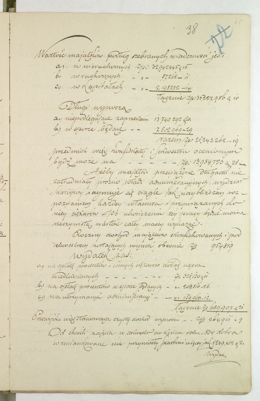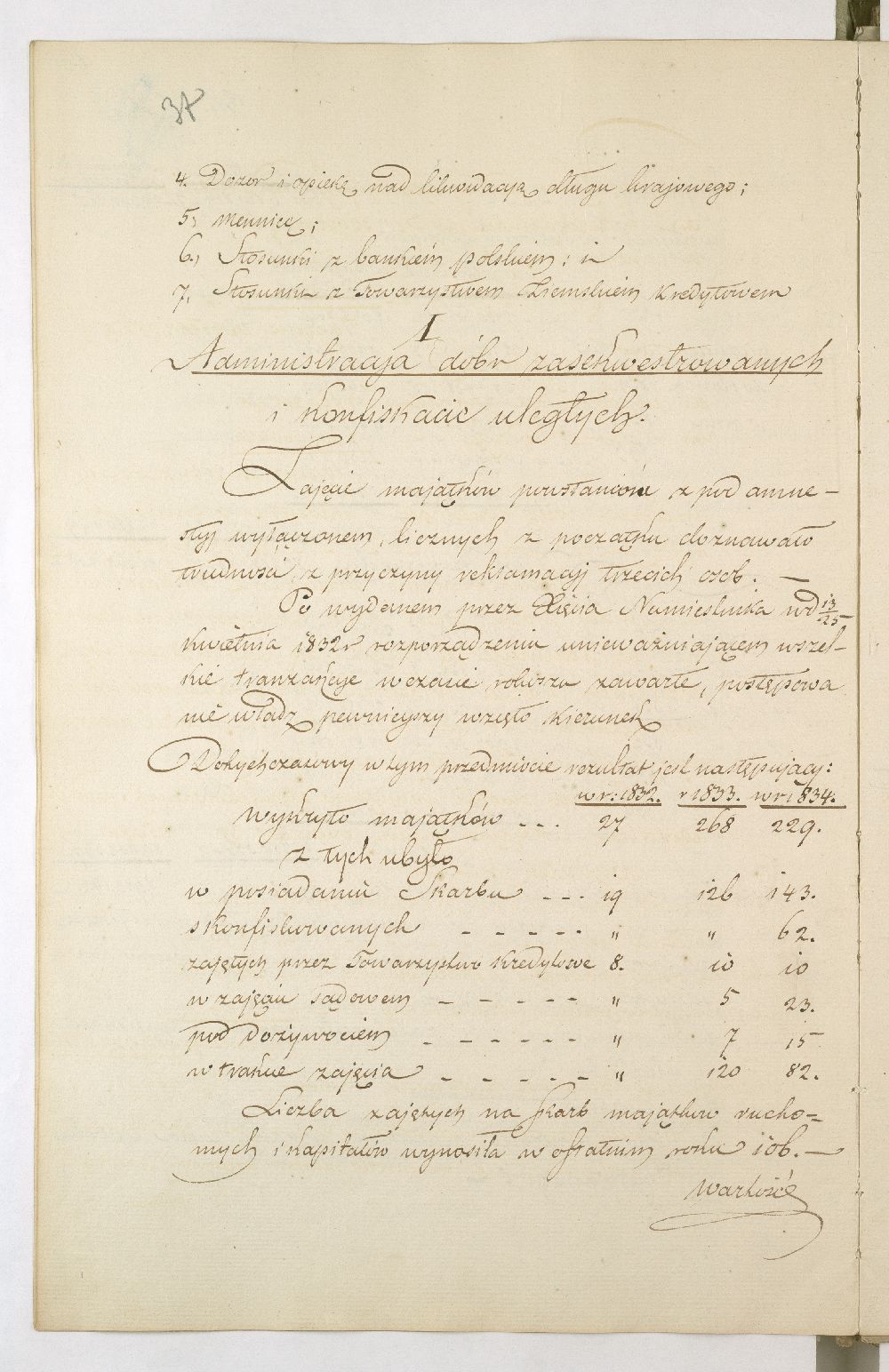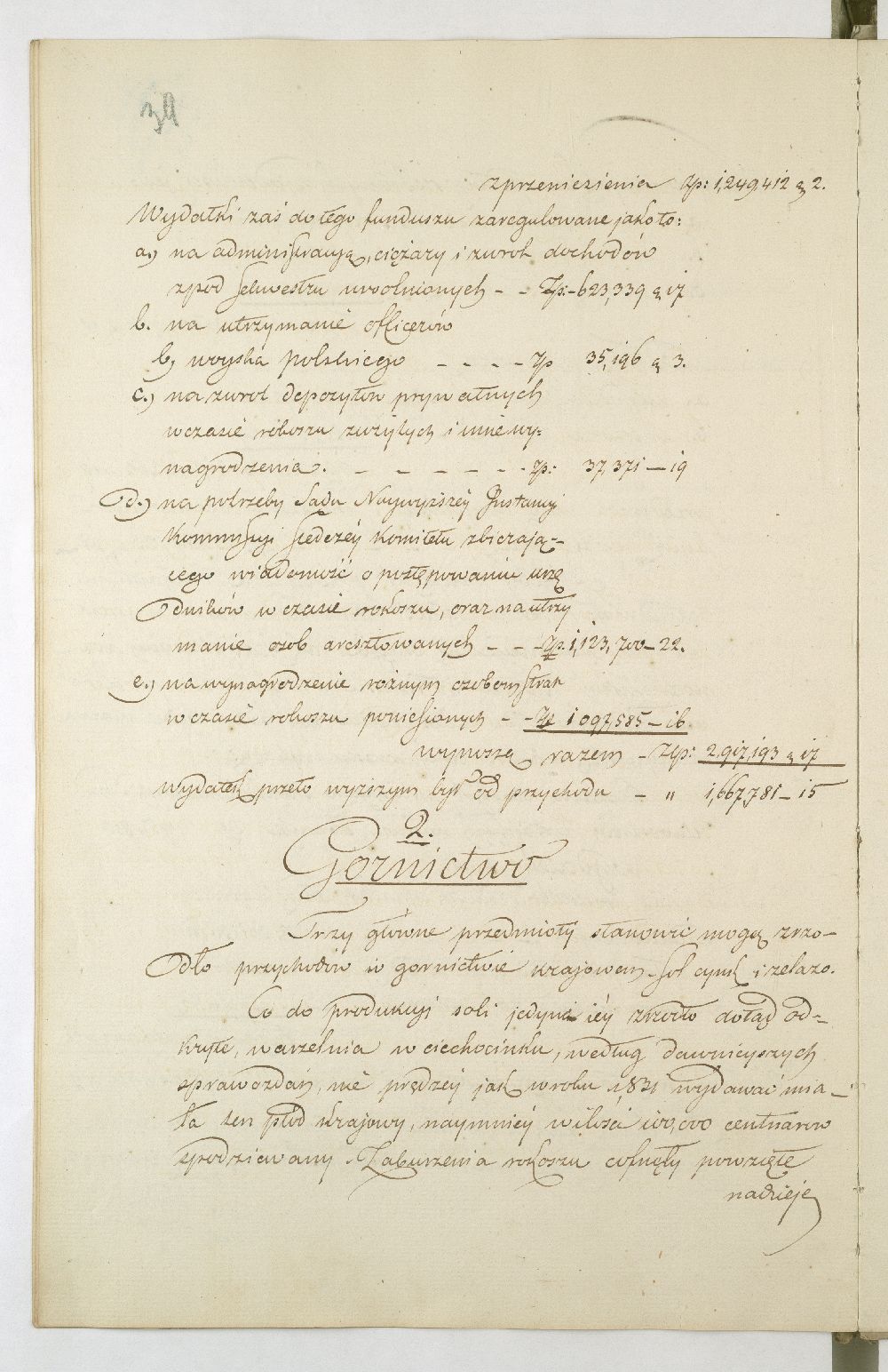Królestwo Polskie po klęsce powstania listopadowego znalazło się w rozpaczliwej sytuacji. Armia polska uległa likwidacji; żołnierzy wcielono do wojska carskiego i wysłano na rubieże imperium. Królestwo musiało ponosić koszty utrzymania 100 tys. okupacyjnej armii rosyjskiej. Nastąpiła likwidacja sejmu, polskich urzędów, przekreślono niezawisłość sądów, a językiem urzędowym został język rosyjski. Zwiększył się ucisk polityczny w szkolnictwie i kulturze (zlikwidowano Uniwersytet Warszawski i Szkołę Przygotowawczą - obecną Politechnikę); wywieziono zbiory Towarzystwa Przyjaciół Nauk; zmniejszono liczbę szkół średnich i podstawowych. Przeprowadzono weryfikację urzędników, usunięto nielojalnych wobec cesarza, a i inni zostali zobowiązani do złożenia przysięgi na wierność monarsze. Wprowadzono instytucje naczelników wojennych, którym podporządkowana została cała administracja cywilna. Zniesiono konstytucję i ograniczono autonomię Królestwa, na które nałożono kontrybucję w wysokości 22,5 mln. rubli w złocie. Rozpoczęła się masowa emigracja osób zaangażowanych w powstanie do Prus i Austrii, a następnie dalej - do Francji, Anglii i Ameryki. Cesarz Mikołaj I ogłosił 1 XI 1831 r. manifest o amnestii, w którym wzywał emigrantów do powrotu, jednak amnestia nie objęła tych, którzy zasiadali w rządzie rewolucyjnym lub poparli w Sejmie wniosek o detronizację, oficerów niektórych korpusów polskich oraz uczestniczących w powstaniu mieszkańców guberni zachodnich (czyli Litwy i Rusi). Sprawy osób nie objętych amnestią rozpatrywał Najwyższy Sąd Kryminalny, powołany dekretem carskim z 25 II 1832 r. W 1832 r. utworzono, na podstawie Statutu Organicznego cesarza Mikołaja I (14/26 II 1832 r.), II Radę Stanu Królestwa Polskiego. Przewodniczył jej namiestnik, a członkami byli dyrektorzy główni, prezydujący w komisjach rządowych i mianowani radcy stanu. W przechowywanych w AGAD aktach II Rady Stanu Królestwa Polskiego znajduje się, zachowany we fragmencie, raport II Rady Stanu Królestwa Polskiego na temat zniszczeń i kosztów powstania listopadowego. Są w nim m.in. informacje dotyczące stanu finansowego górnictwa z podziałem na kopalnie, huty, budowle, sprzedaż wyrobów. Dalej przedstawiony jest stan finansów w Funduszu Stowarzyszenia Cywilno-Emerytalnego, informacja o likwidacji długu publicznego, stanie mennicy i banku oraz o finansach Towarzystwa Kredytowego Ziemskiego i Najwyższej Izby Obrachunkowej. Obszerny fragment raportu stanowi rozdział pt. „Administracja dóbr zasekwestrowanych i konfiskacie uległych”. We wspomnianym manifeście cesarskim z listopada 1831 r. nie było mowy o konfiskacie majątków, a jedynie o sekwestrze, czyli przymusowym zarządzie dóbr powstańców. Sprawa konfiskat pojawiła się dopiero w ukazie o nadaniu Królestwu Statutu Organicznego. W prezentowanym dokumencie, II Rada Stanu informuje o liczbie zajętych majątków w danym roku kalendarzowym, które to „zajęcie [...], powstańcom spod amnestii wyłączonem, licznych z początku doznawało trudności, z przyczyny reklamacji trzecich osób”. Rodziny emigrantów bowiem, starały się udowodnić swoje prawa do zajętych dóbr, i dopiero po ukazaniu się w 1832 r. rozporządzenia namiestnika, unieważniającego wszelkie transakcje zawarte w czasie rokoszu, konfiskaty uległy przyspieszeniu. I tak w 1832 r. „wykryto” 27 majątków, z czego 19 znalazło się w posiadaniu Skarbu, a 8 zostało zajętych przez Towarzystwo Kredytowe. W 1833 r. „wykrytych” majątków było 268, z czego 126 przejął Skarb, 10 zajęło Towarzystwo Kredytowe; w stosunku do 5 nastąpiło zajęcie sądowe, 7 znajdowało się „pod dożywociem”, a 120 było w trakcie zajęcia. W 1834 r. „wykrytych” majątków było 229, z czego 143 znalazło się w posiadaniu Skarbu, 62 zostało skonfiskowanych, 10 zajętych przez Towarzystwo Kredytowe, 23 zajęte sądownie, 15 - dożywotnio i 82 - w trakcie zajęcia; ponadto zajęto 106 majątków ruchomych i kapitałów. Wartość zajętych majątków (ruchomych, nieruchomych i kapitałów) szacowano na 35 227 986 rubli. Jednocześnie raport informuje o długach tych majątków wobec Skarbu, wynoszących 21 243 262,19 rubli; tak więc realną wartość „przedmiotu” konfiskat i sekwestru oceniono na 13 984 723,21 rubli. Dalej następuje informacja o dochodach z zajętych dóbr i wydatkach na utrzymanie skonfiskowanych majątków i ich administrację. Po podliczeniu wszystkich kwot II Rada Stanu Królestwa Polskiego informuje, że rozchód jest wyższy od przychodu o 1 667 781,15 rubli. Konfiskaty stały się powodem wielu procesów wytaczanych przez wierzycieli, współwłaścicieli i spadkobierców. Do końca 1836 r. odbyło się ponad 1300 takich procesów. Raport, sporządzony ok. 1835 r., został podpisany przez Józefa Rautenstraucha (1773-1842), polskiego i rosyjskiego generała, przeciwnika powstania listopadowego, lojalnego poddanego cesarza rosyjskiego. Po upadku powstania Rosenstrauch został naczelnikiem wojennym województwa mazowieckiego, członkiem Rządu Tymczasowego, który kierował resortem Oświecenia i Wyznań Religijnych. Ponadto pod raportem znajduje się podpis członka Rady Stanu Józefa Kalasantego Szaniawskiego (1764-1843), uczestnika powstania kościuszkowskiego, emigranta, który w Królestwie Polskim przeszedł na stronę władzy i pełnił różne funkcje urzędowe (m.in. był cenzorem). Poniżej podpisany jest [Karol Fryderyk] Woyda (1771-1845), były prezydent Warszawy (1816-1830), który po wybuchu powstania wyjechał z Warszawy, a po jego upadku powrócił jako dyrektor Komisji Rządowej Spraw Wewnętrznych i Policji. Jako ostatni dokument podpisał referendarz stanu Ludwik Osiński (1775-1838), przeciwnik powstania, który jednak wziął w nim udział jako prezes Rady Municypalnej w Warszawie. Po powstaniu pracował jako referendarz stanu w Wydziale W